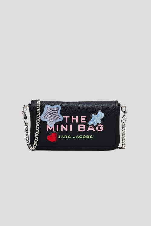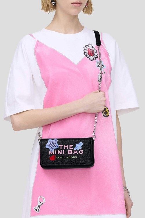 Детали: Женская черная кожаная сумка кросс-боди The Sticker Patch Mini Bag от Marc Jacobs (Марк Джейкобс). Модель из зернистой кожи, принт с логотипом, разноцветные нашивки, серебристая фурнитура, цепочка на плечо, застежка на магнит, одно отделение. Размеры: длина 20 см, глубина 5 см, высота 12 см