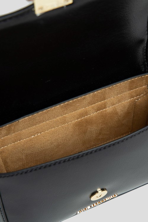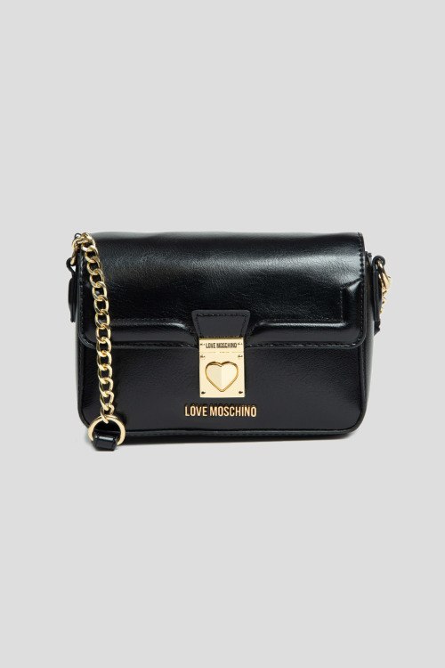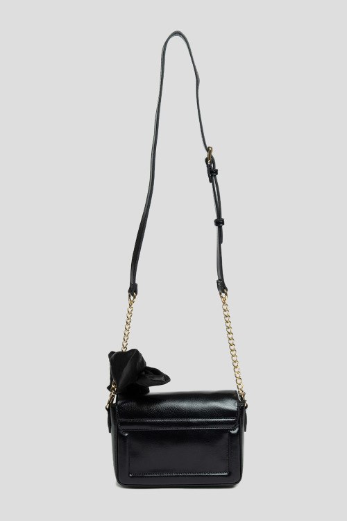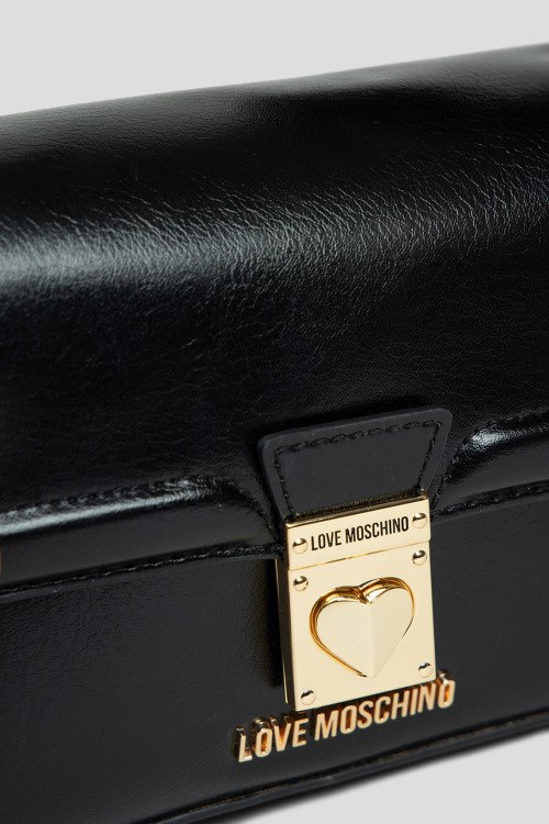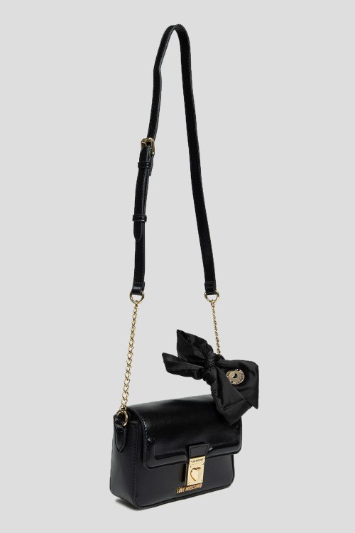 Детали: Женская черная сумка кросс-боди из экокожи от Love Moschino (Лав Москино). Значок с логотипом, золотистая фурнитура, регулируемый плечевой ремень с текстильным бантом, застежка на магнит, одно отделение. Размеры: 19 х 14,5 х 6,5 см