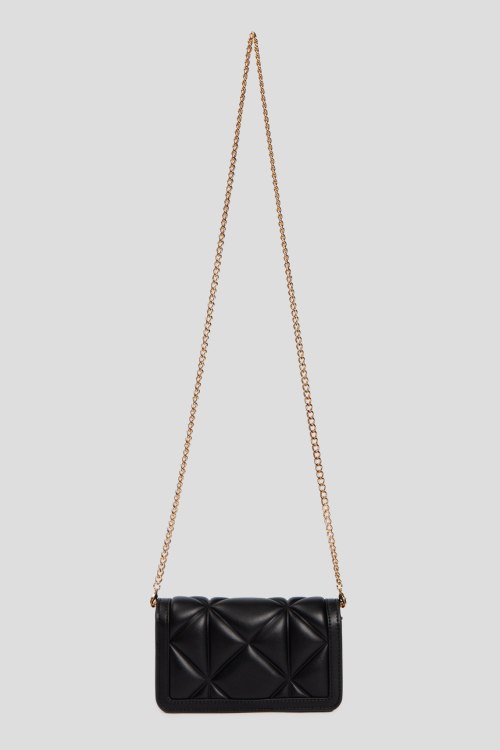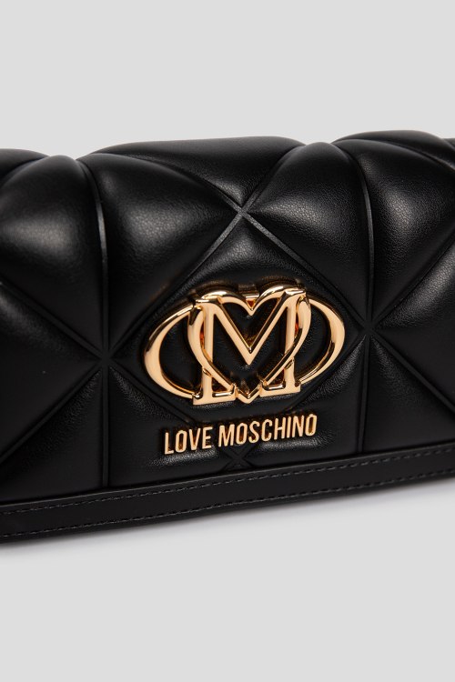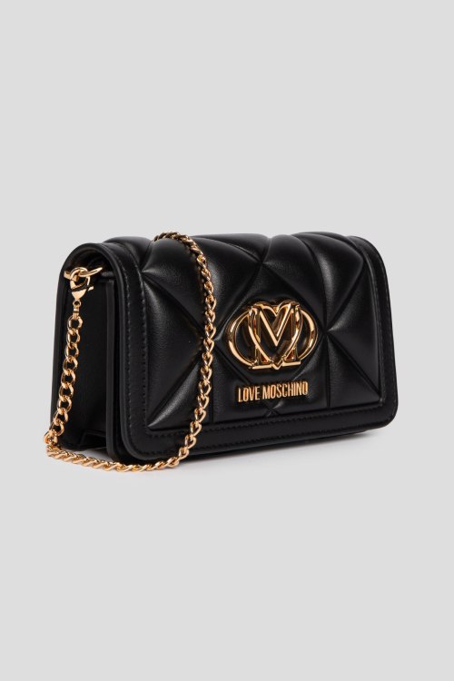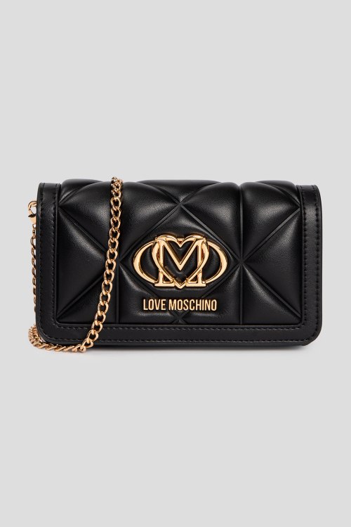 Детали: Женская черная сумка кросс-боди из экокожи от Love Moschino (Лав Москино). Стеганый дизайн, застежка с клапаном на кнопку, одно отделение, внутренний карман на молнии, металлический логотип бренда, плечевой ремень цепочка. Измерения: 18х10,5х4,5 см, длина цепочки 54 см