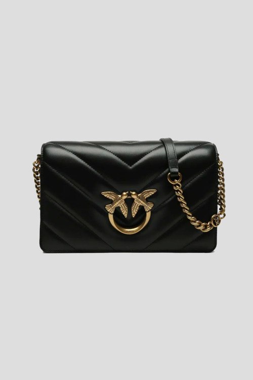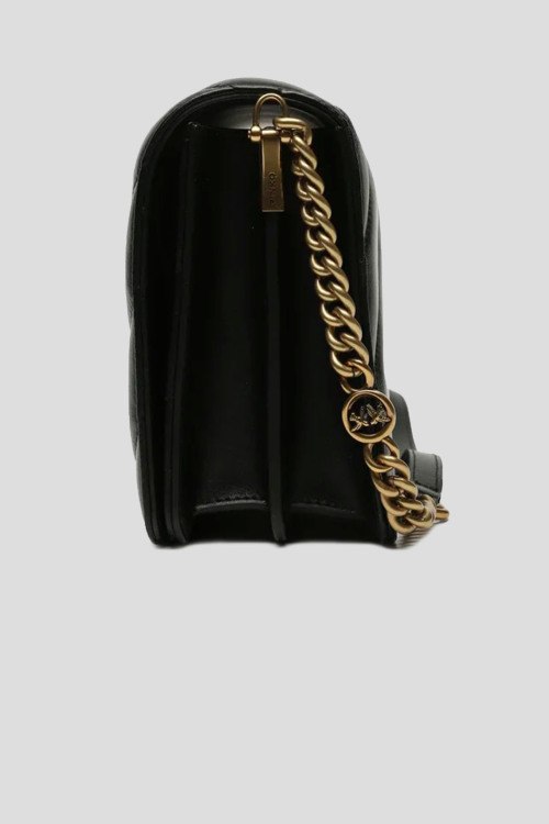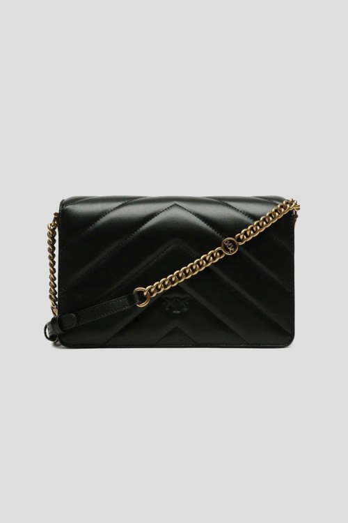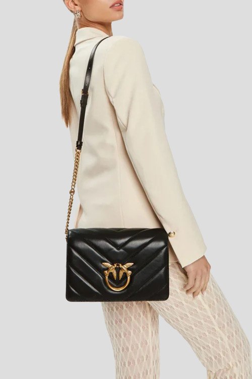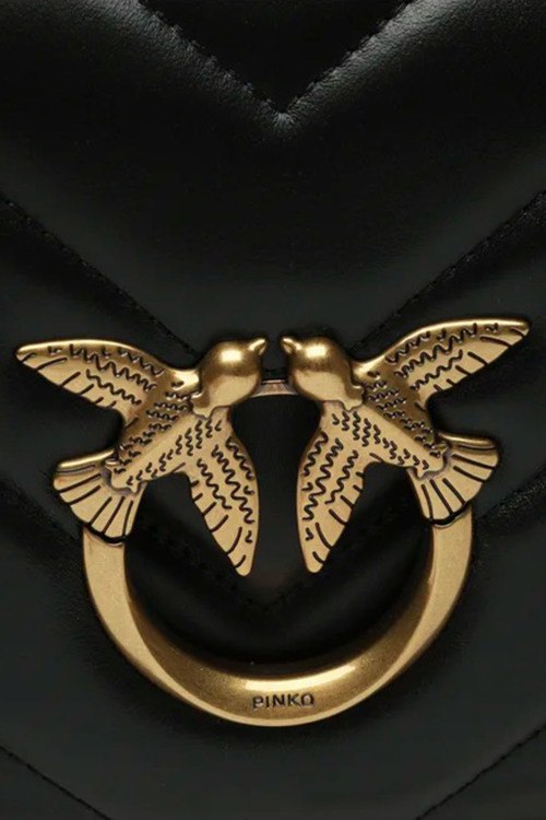 Детали: Женская черная кожаная сумка кросс-боди Classic Love Bag Click от Pinko (Пинко). Модель отличается крупным стеганым шевронным узором. Застежку на потайную кнопку украшает легендарная пряжка Love Birds Diamond Cut с декоративным вырезом, выполненная из металла с гальваническим покрытием цвета античного золота. Внутреннее отделение на подкладке из микрофибры с замшевым эффектом дополнено карманом-перегородкой на молнии и плоским карманом. Плечевой ремень представляет собой комбинацию металлической цепочки с круглыми звеньями и логотипом Love Birds и практичного регулируемого наплечника из кожи. Размеры: 25 x 16 x 8.5 см
