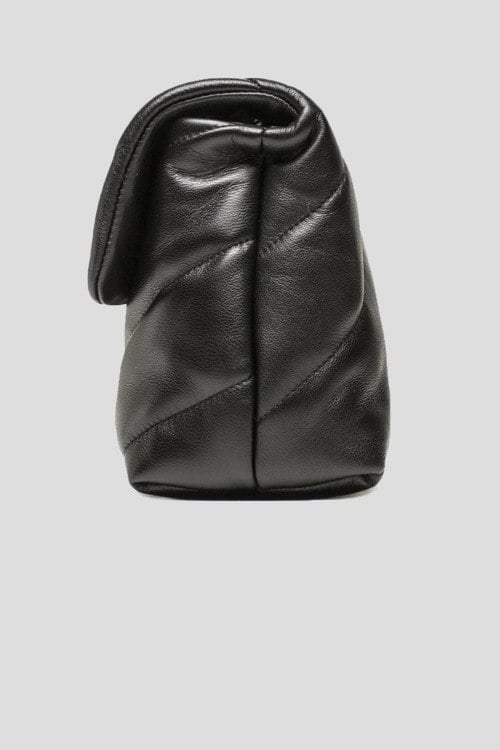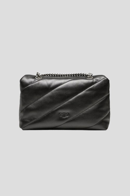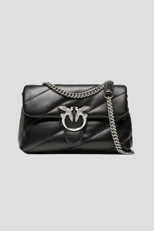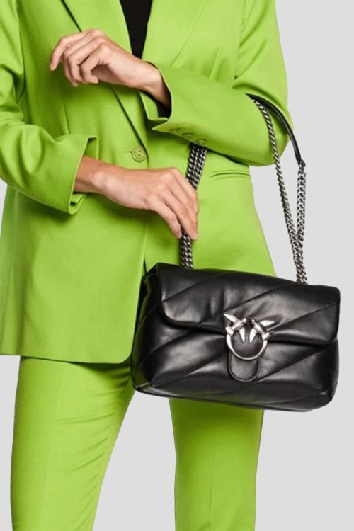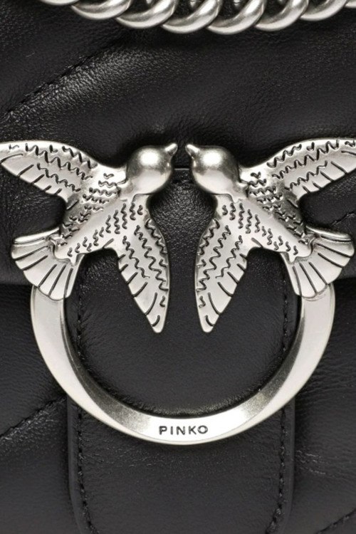 Детали: Женская черная кожаная сумка кросс-боди Love Bag Puff от Pinko (Пинко). Выполнена из мягкой кожи наппа с крупным диагональным стеганым узором. Застежку украшает легендарная металлическая пряжка Love Birds Diamond Cut. Внутреннее отделение на подкладке из замшевой микрофибры дополнено карманом-перегородкой на молнии и плоским карманом. Плечевой ремень представляет собой комбинацию классической металлической цепочки с круглыми звеньями и практичного наплечника из кожи наппа. Размеры: высота 17 см, глубина 10 см, ширина 27 см