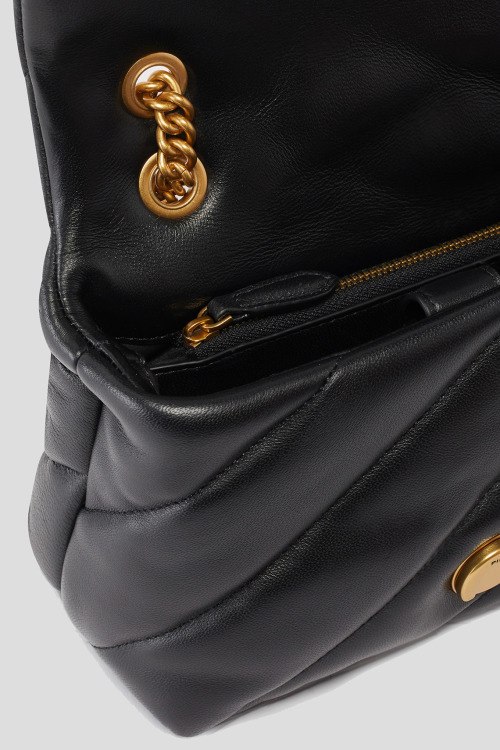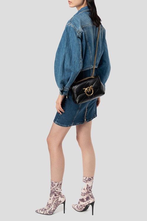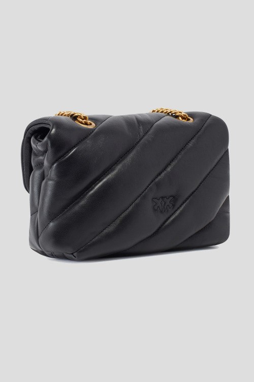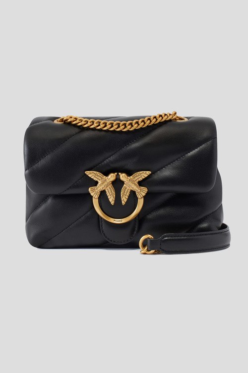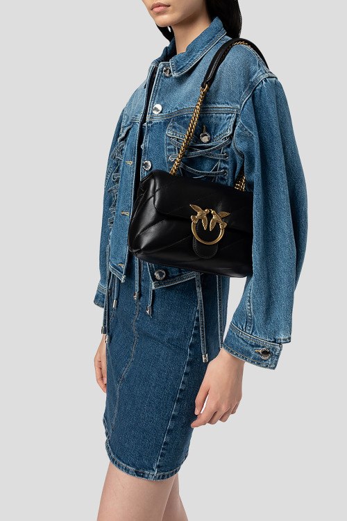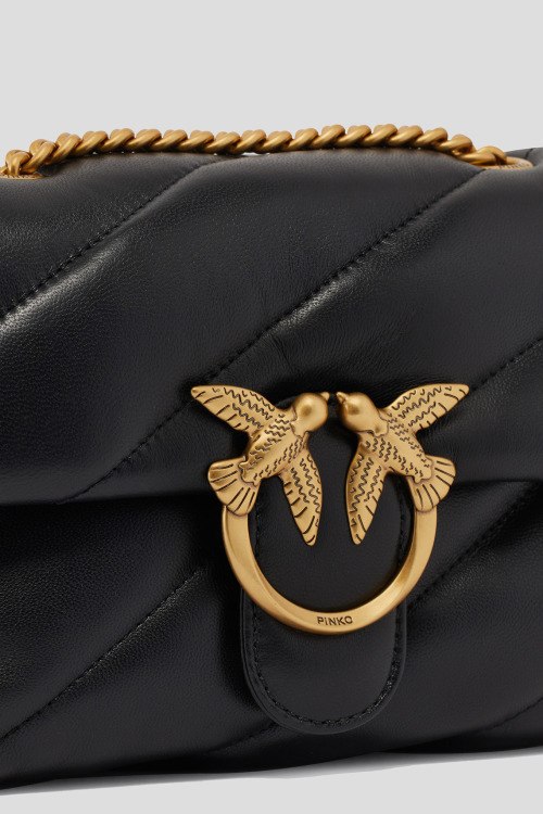 Детали: Женская черная кожаная сумка кросс-боди Mini Love Bag Puff от Pinko (Пинко). Модель из гладкой кожи, стеганый дизайн, логотип Love Birds, золотистая фурнитура, застежка на магнит, одно отделение, цепочка на плечо. Размеры: высота: 15 см, ширина: 9 см, длина: 21 см