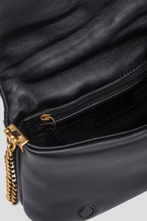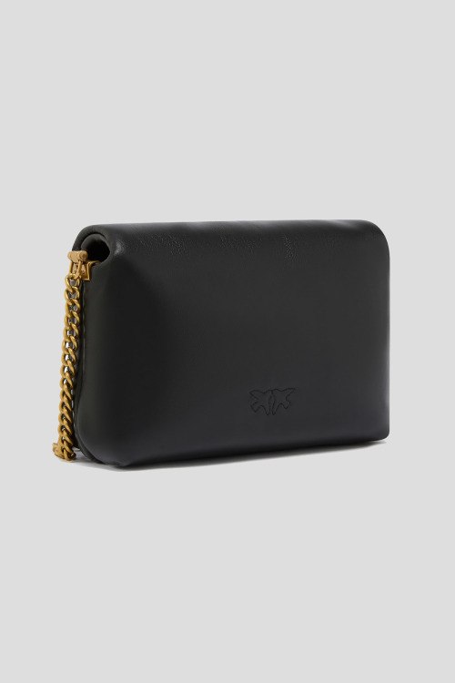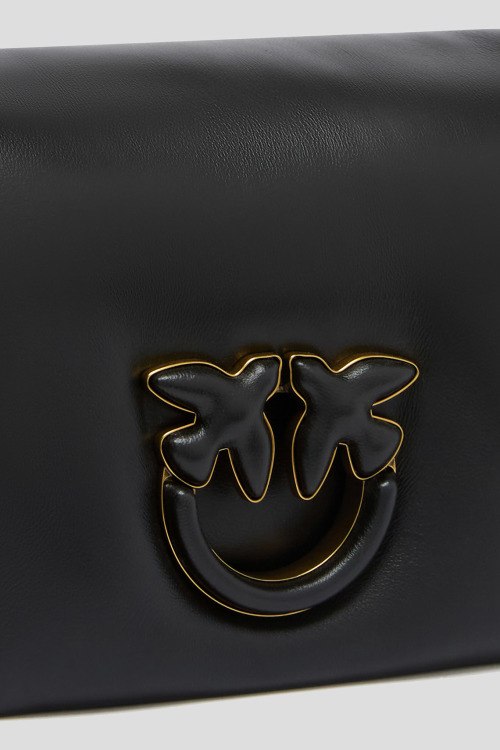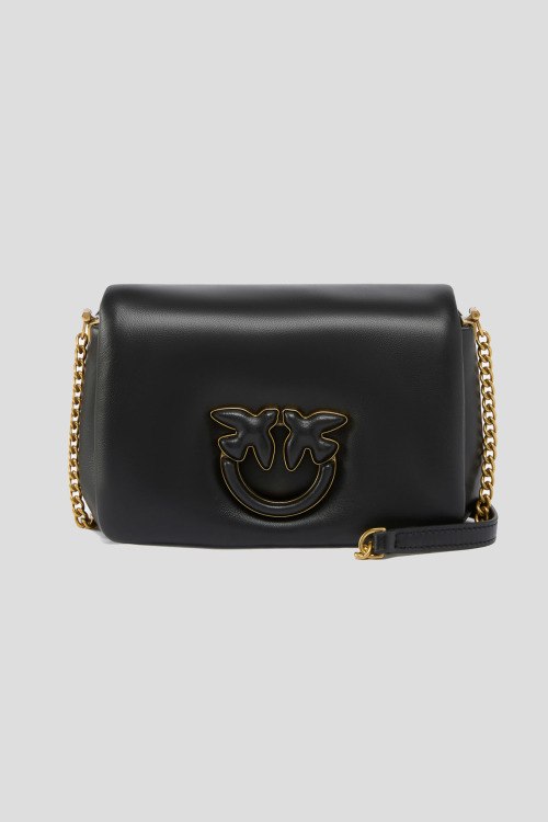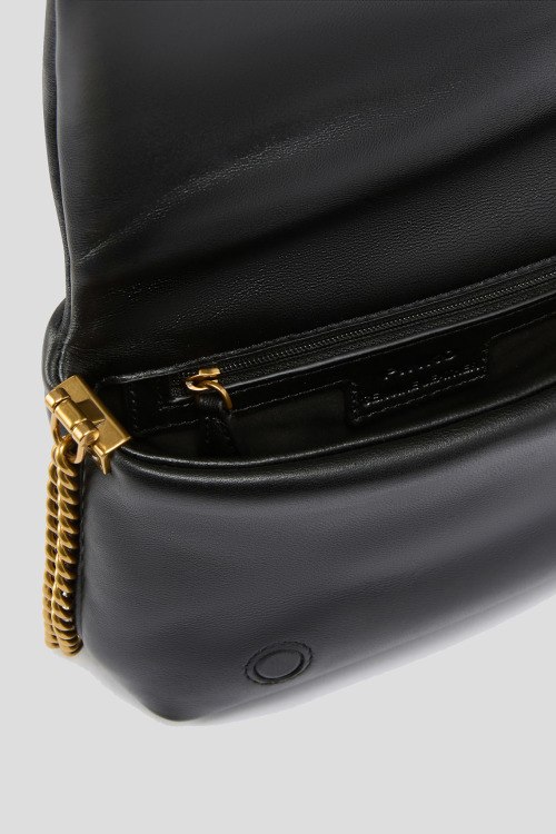 Детали: Женская черная кожаная сумка кросс-боди Baby Love Bag Click Puff от Pinko (Пинко). Модель из гладкой кожи, логотип Love Birds, золотистая фурнитура, застежка на магнит, одно отделение, цепочка на плечо. Размеры: высота: 13 см, ширина: 6 см, длина: 17 см