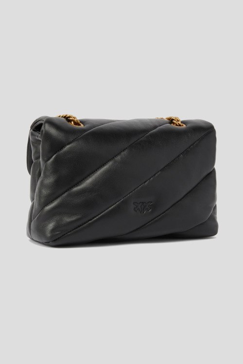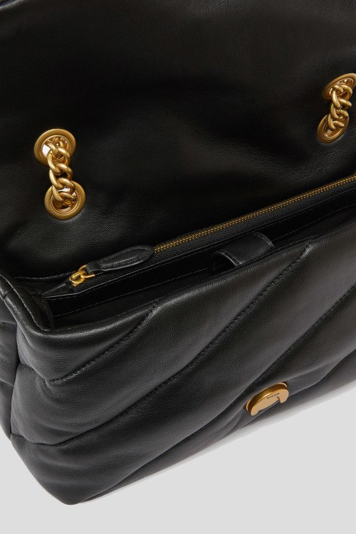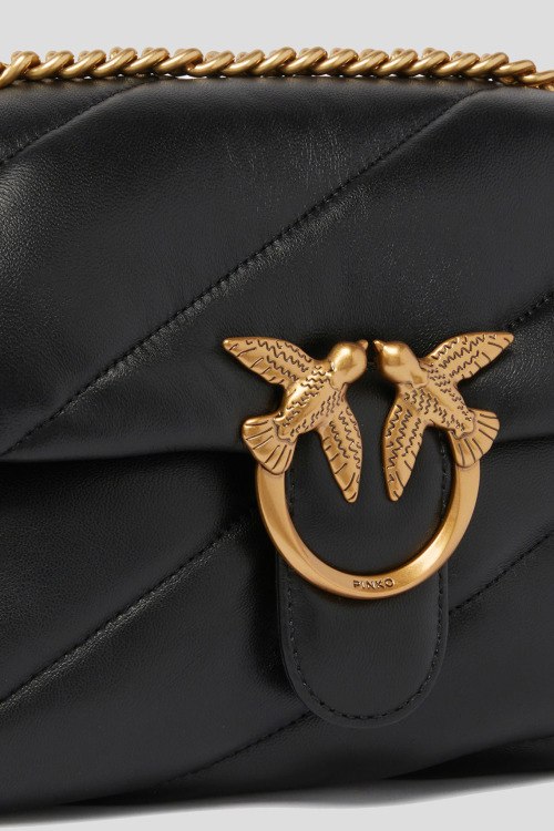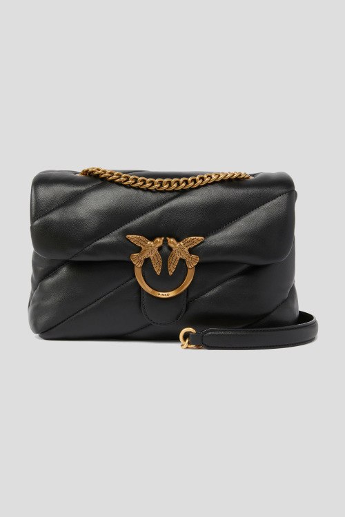 Детали: Женская черная кожаная сумка кросс-боди Classic Love Bag Puff Maxi от Pinko (Пинко). Модель из гладкой кожи, стеганый дизайн, логотип Love Birds, бронзовая фурнитура, застежка на магнит, одно отделение, цепочка на плечо. Размеры: высота 19 см, ширина 11 см, длина 26 см