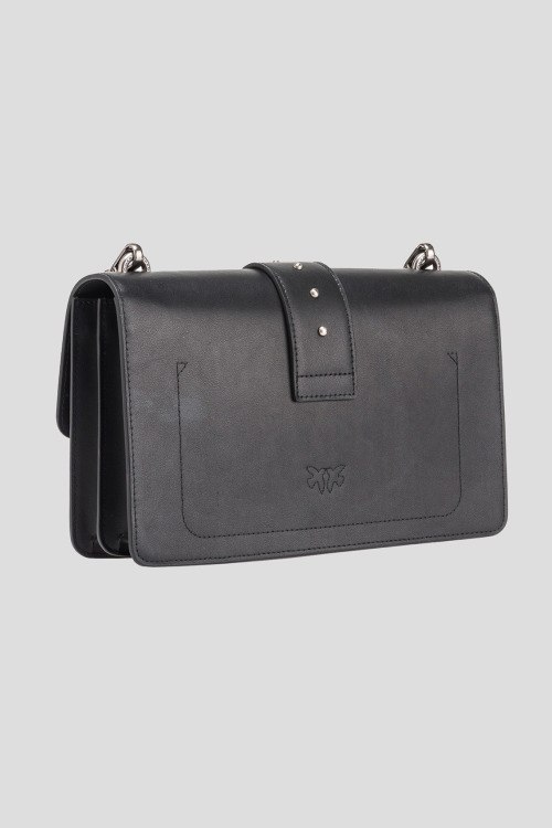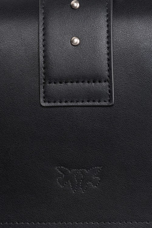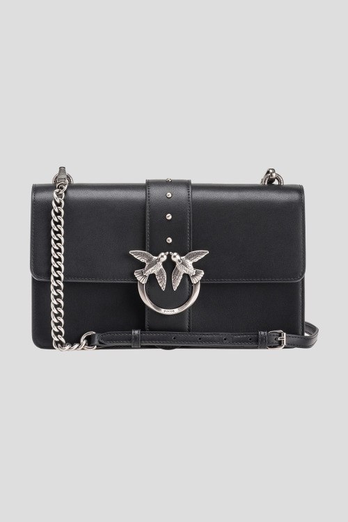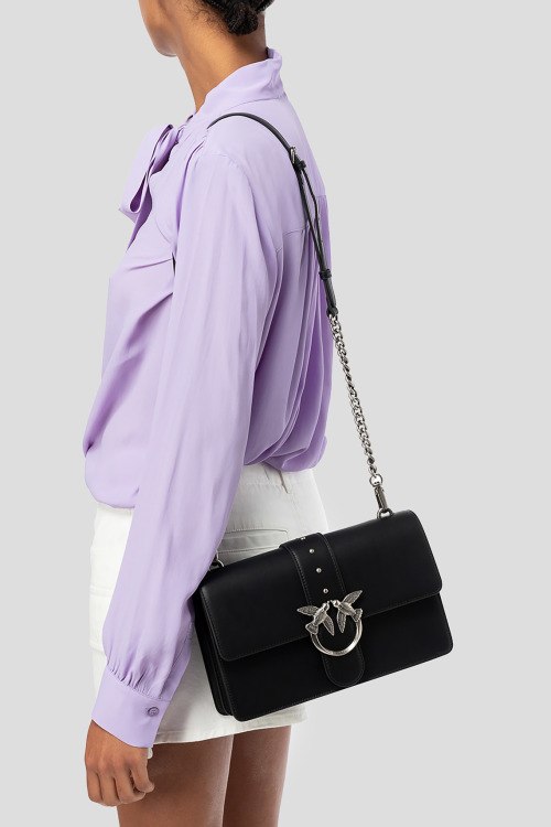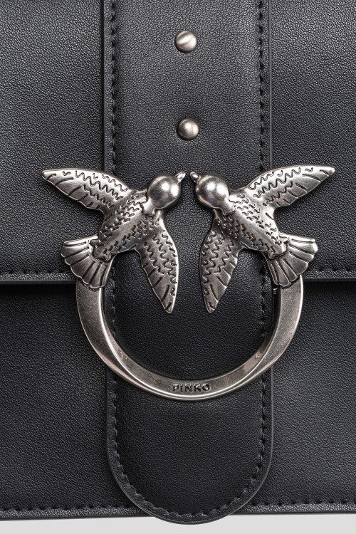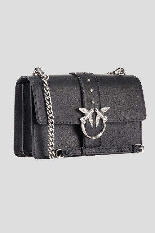 Детали: Женская черная кожаная сумка кросс-боди Love One Classic от Pinko (Пинко). Модель из гладкой кожи, логотип Love Birds, декор заклепками, серебристая фурнитура, застежка на магнит, одно отделение, цепочка на плечо. Размеры: 27 x 17 x 7 см
