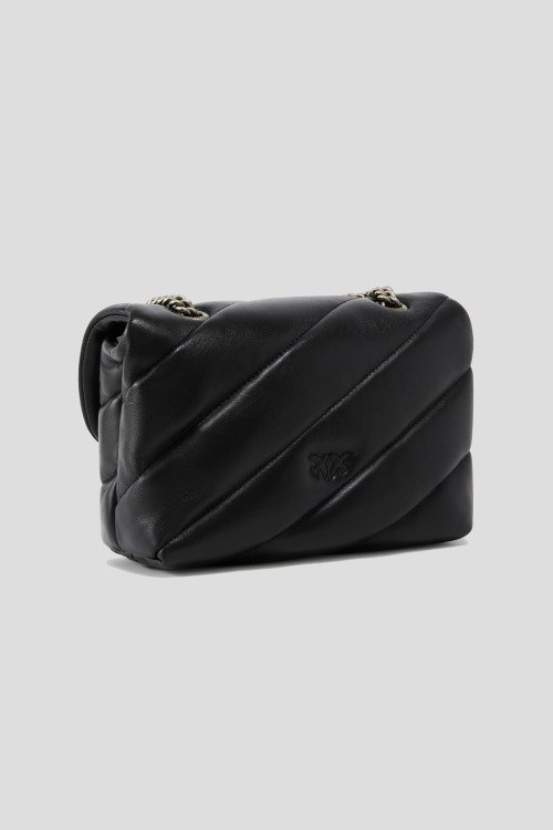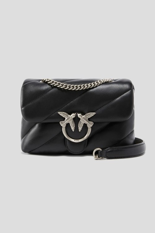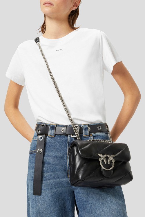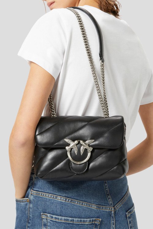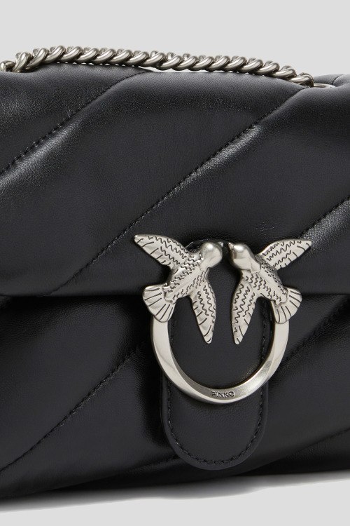 Детали: Женская черная кожаная сумка кросс-боди Love Mini Puff от Pinko (Пинко). Модель из гладкой кожи, стеганый дизайн, логотип Love Birds, серебристая фурнитура, застежка на магнит, одно отделение, цепочка на плечо. Размеры: высота: 15 см, ширина: 9 см, длина: 21 см