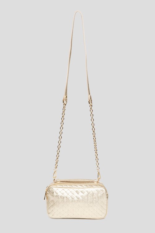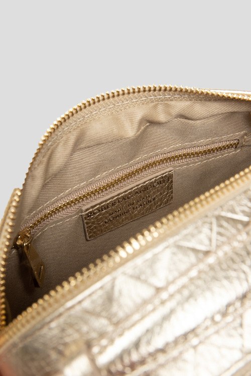 Детали: Женская золотистая сумка кросс-боди из натуральной кожи от Roberta Gandolfi (Робэрта Гандолфи). Два отделения на молнии, внутренний карман на молнии, верхняя ручка, съемный плечевой ремень из кожи и цепочки. Измерения: высота: 12 см, ширина: 23 см, высота ручек: 2 см, длина плечевого ремня: 60 см, ширина по дну: 10 см
