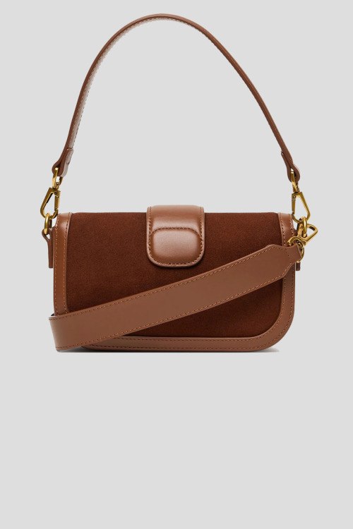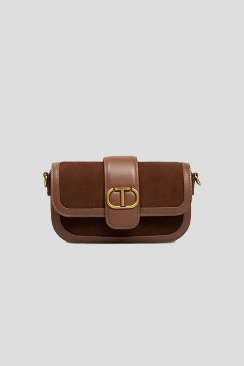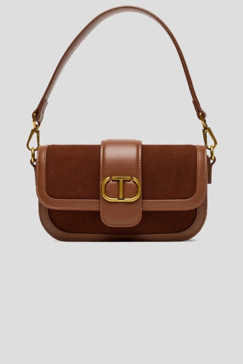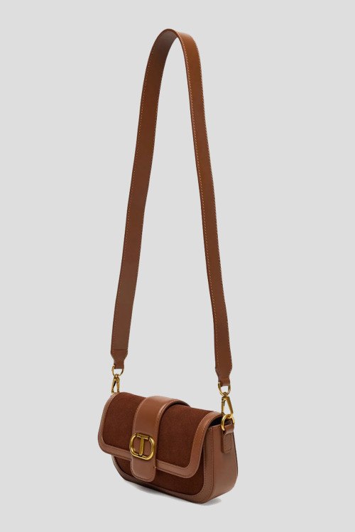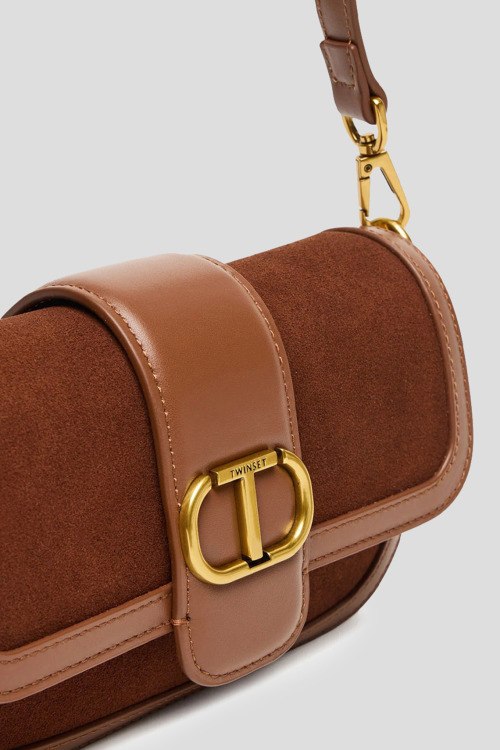Детали: Женская коричневая сумка кросс-боди из замши и кожи от TWINSET (Твинсет). Комбинация материалов, золотистая фурнитура, значок с логотипом, съемная круглая ручка, съемный плечевой ремень, застежка на магнит, одно отделение. Размеры: 21.5 x 12.5 x 5 см