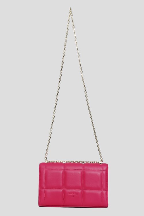 Детали: Женская малиновая сумка кросс-боди из натуральной кожи от Patrizia Pepe (Патриция Пепе). Стеганый дизайн, декор мини-заклепками Fly, тисненый логотип сзади, прямоугольная форма, застежка на кнопку, два основных отделения, внутренний карман на молнии, плечевой ремень-цепочка. Измерения: глубина: 6,5 см, высота: 15 см, ширина у основания: 24 см