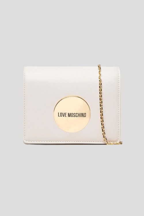 Детали: Женская сумка кросс-боди из экокожи молочного оттенка от Moschino (Москино). Значок с логотипом, золотистая фурнитура, застежка на магнит, одно отделение, цепочка на плечо. Размеры: 16 х 13 х 9 см. Максимальная длина ремешка: 117 см