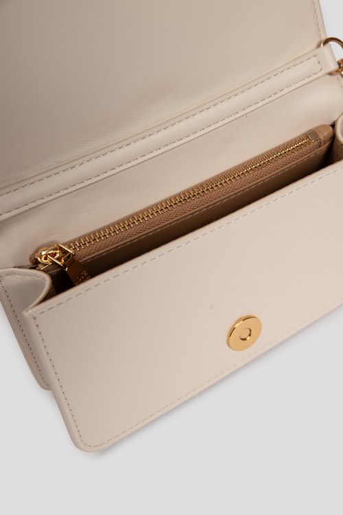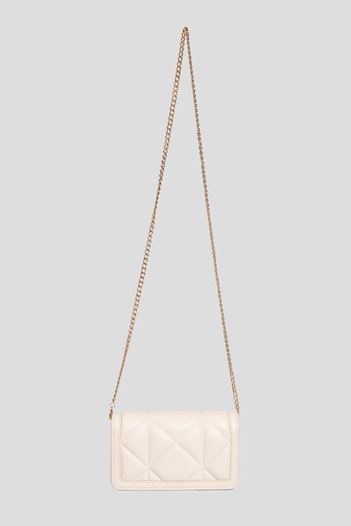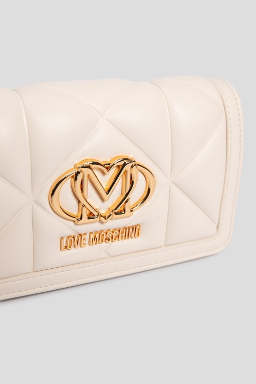 Детали: Женская сумка кросс-боди молочного оттенка из экокожи от Love Moschino (Лав Москино). Стеганый дизайн, застежка с клапаном на кнопку, одно отделение, внутренний карман на молнии, металлический логотип бренда, плечевой ремень цепочка. Измерения: 18х10,5х4,5 см, длина цепочки 54 см