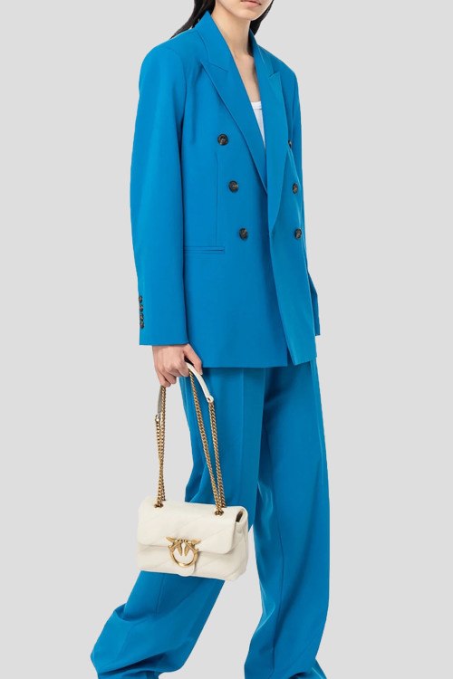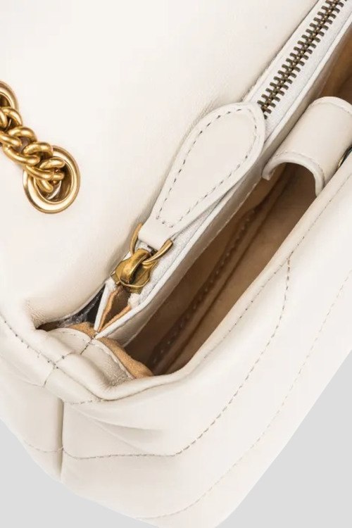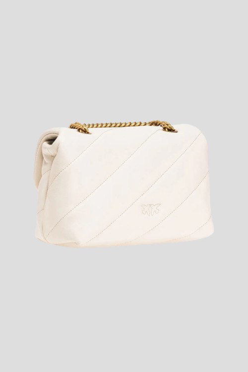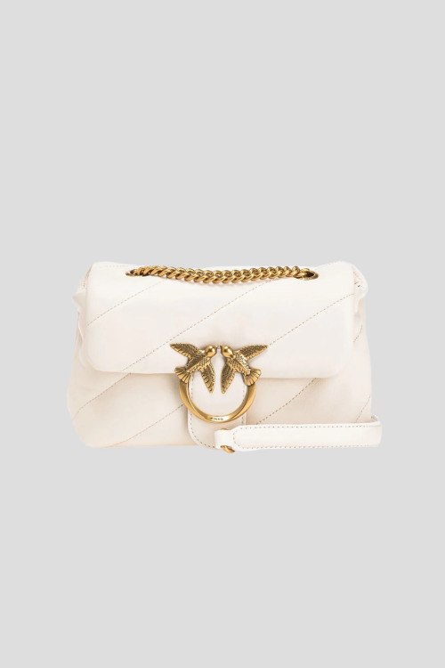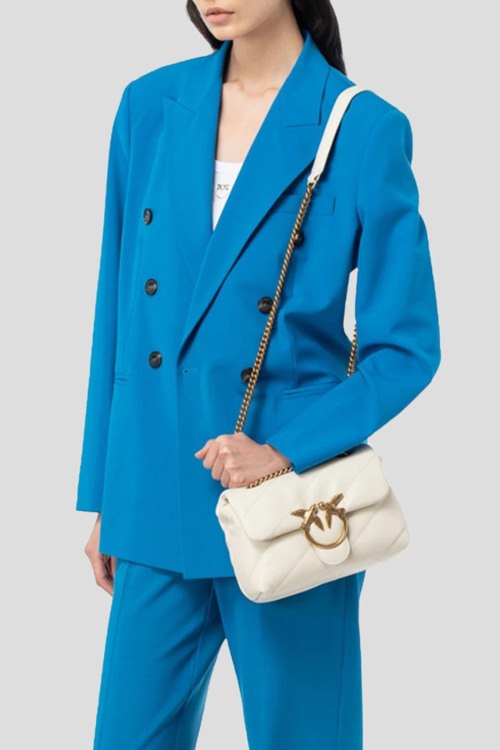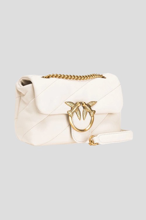 Детали: Женская кожаная сумка кросс-боди молочного оттенка Mini Love Bag Puff от Pinko (Пинко). Выполнена из мягкой кожи наппа с крупным диагональным стеганым узором. Застежку украшает легендарная металлическая пряжка Love Birds Diamond Cut. Внутреннее отделение на подкладке из замшевой микрофибры дополнено карманом-перегородкой на молнии и плоским карманом. Плечевой ремень представляет собой комбинацию классической металлической цепочки с круглыми звеньями и практичного наплечника из кожи наппа. Размеры: высота: 15 см, ширина: 9 см, длина: 21 см