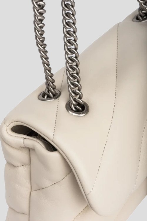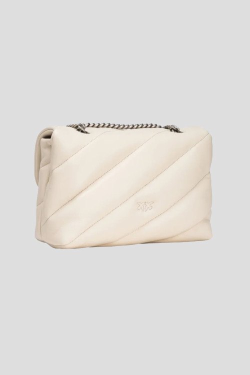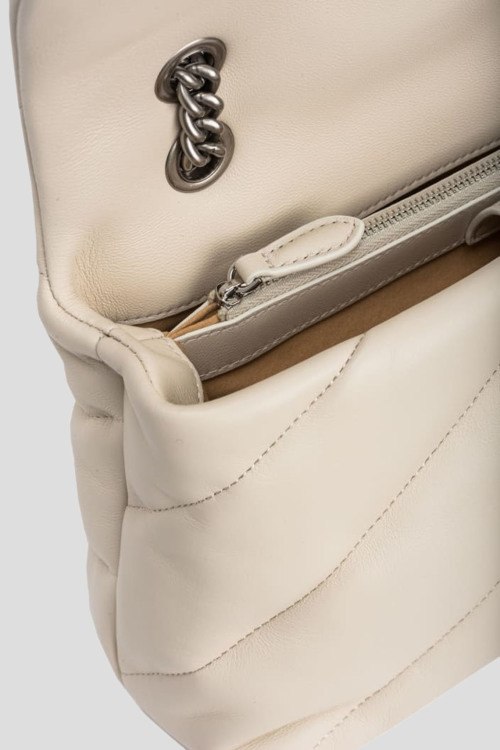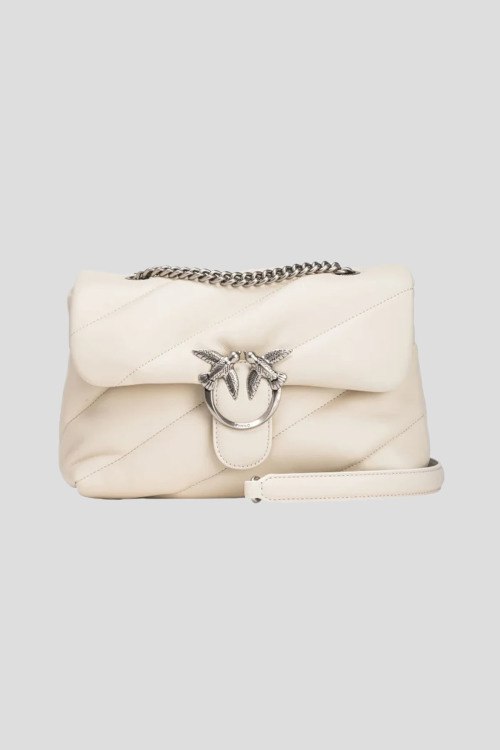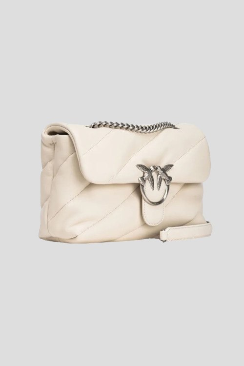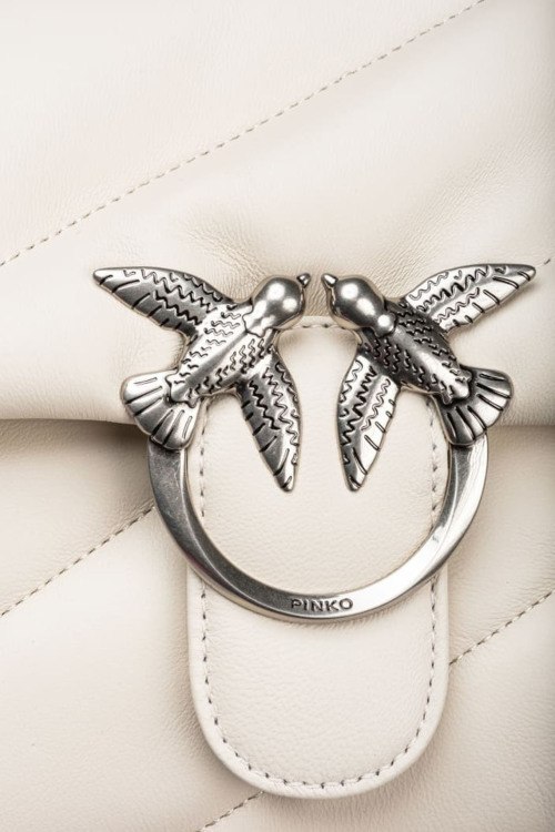 Детали: Женская кожаная сумка кросс-боди молочного оттенка Love Bag Puff от Pinko (Пинко). Выполнена из мягкой кожи наппа с крупным диагональным стеганым узором. Застежку украшает легендарная металлическая пряжка Love Birds Diamond Cut. Внутреннее отделение на подкладке из замшевой микрофибры дополнено карманом-перегородкой на молнии и плоским карманом. Плечевой ремень представляет собой комбинацию классической металлической цепочки с круглыми звеньями и практичного наплечника из кожи наппа. Размеры: 19 х 11 х 26 см