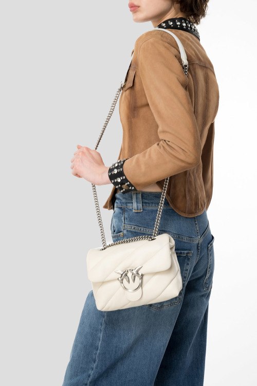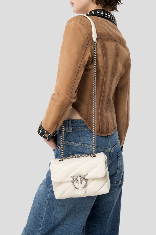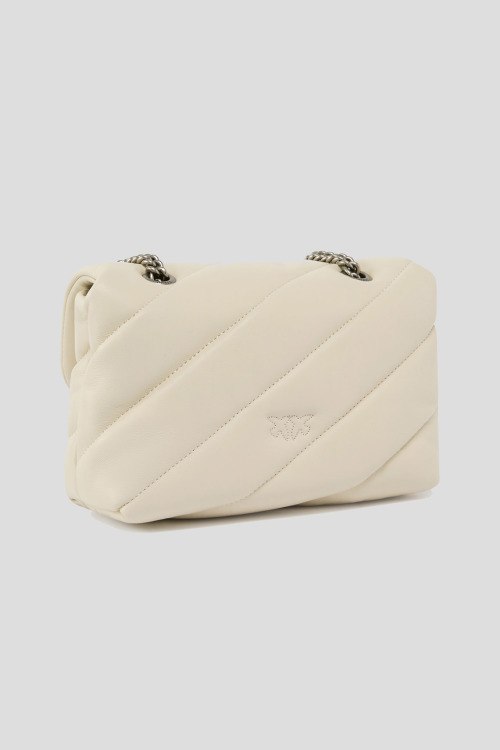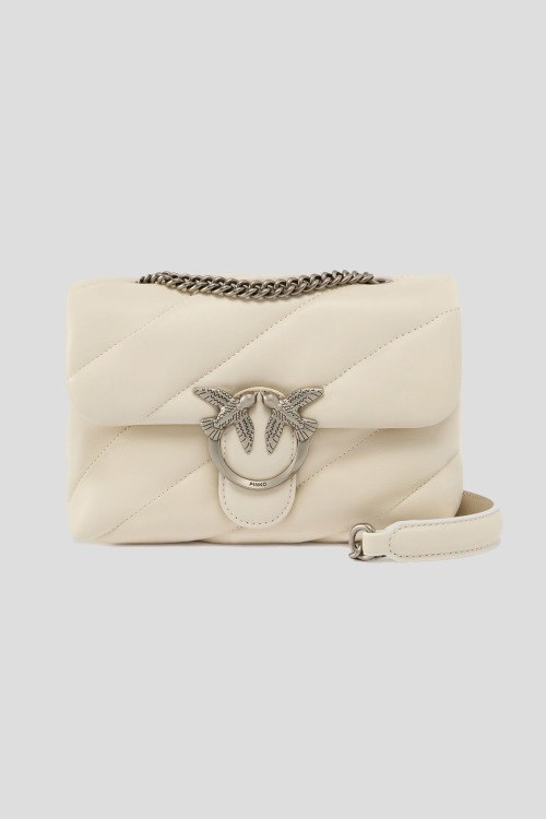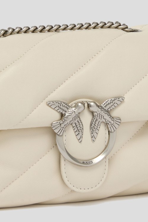 Детали: Женская кожаная сумка кросс-боди молочного оттенка Mini Love Bag Puff от Pinko (Пинко). Модель из гладкой кожи, стеганый дизайн, логотип Love Birds, серебристая фурнитура, застежка на магнит, одно отделение, цепочка на плечо. Размеры: высота: 15 см, ширина: 9 см, длина: 21 см