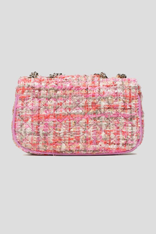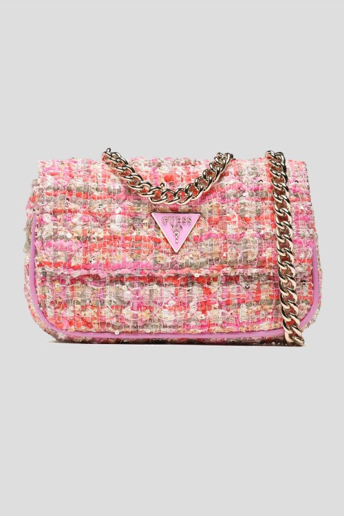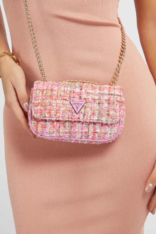 Детали: Женская твидовая розовая сумка кросс-боди Spark Micro от Guess (Гесс). Значок с логотипом, золотистая фурнитура, два ремешка с пряжками, плечевая цепочка, застежка на магнит, одно отделение. Размер: 17X11X6 см. Высота ручки/ремня: 32/55 см