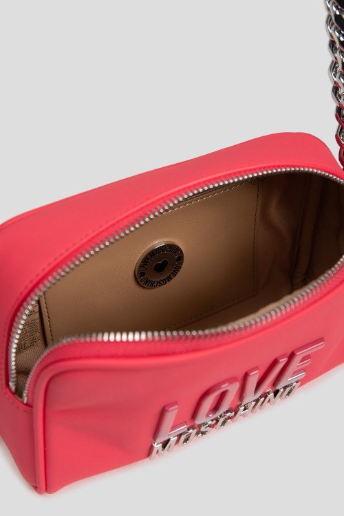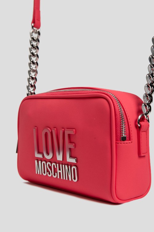Детали: Женская розовая сумка кросс-боди из экокожи от Love Moschino (Лав Москино). Одно отделение, застежка на молнию, металлический логотип бренда с градиентом, регулируемый плечевой ремень из экокожи и цепочки