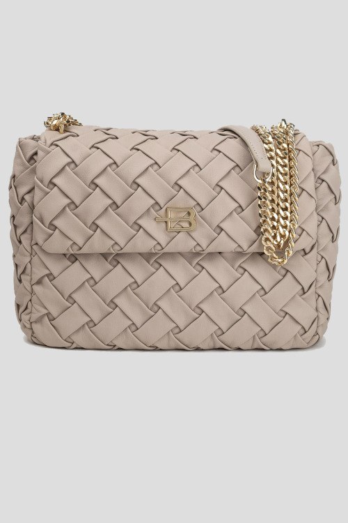 Детали: Женская серая кожаная сумка кросс-боди от Baldinini (Балдинини). Плетеный дизайн, значок с логотипом, золотистая фурнитура, цепочка на плечо, застежка на магнит, одно отделение