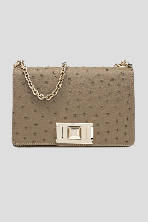 Детали: Женская кожаная сумка кросс-боди цвета тауп Mimi от Furla (Фурла). Прямоугольная форма, внутри одно отделение, дизайн с неровностями, плечевой ремень-цепочка, фурнитура золотистого цвета, металлическая застежка. Размеры: 24 x 16 x 8,5 см. Высота ручки/ремня: 15/56 см
