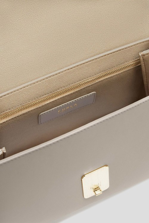 Детали: Женская серо-бежевая кожаная сумка кросс-боди Meridiana от Furla (Фурла). Модель из гладкой кожи, золотистая фурнитура, цепочка, застежка на защелку, одно отделение, регулируемый плечевой ремень. Размер: 27 x 17,5 x 9,5 см