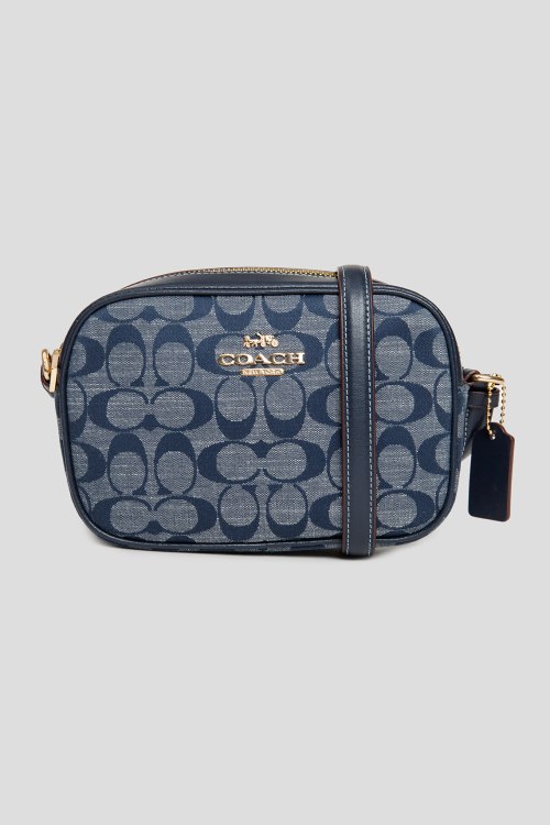Женская синяя сумка кросс-боди Jamie Denim от Coach (Коуч). Канва с монограммой, кожаные вставки, значок с логотипом, золотистая фурнитура, регулиуемый плечевой ремень, застежка-молния, одно основное отделение. Измерения: 19х13х6 см