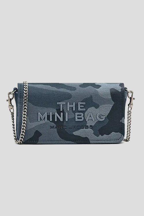 Детали: Женская темно-синяя жаккардовая сумка кросс-боди Camo Jacquard Chain Mini Bag от Marc Jacobs (Марк Джейкобс). Камуфляжный принт, вышитый логотип, серебристая фурнитура, плечевой ремень-цепочка, застежка на магнит, одно отделение. Размеры: 20 x 4 х 12 см