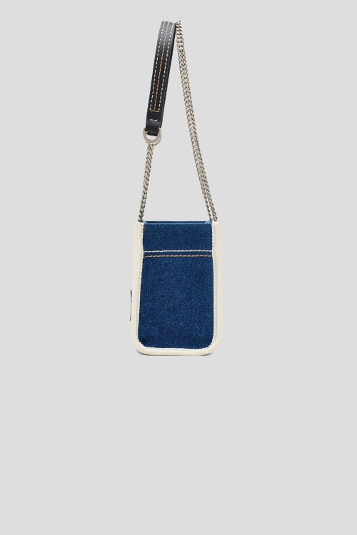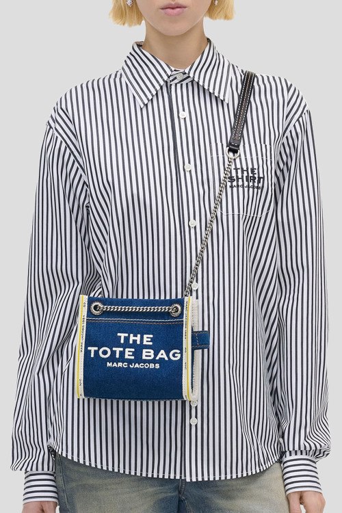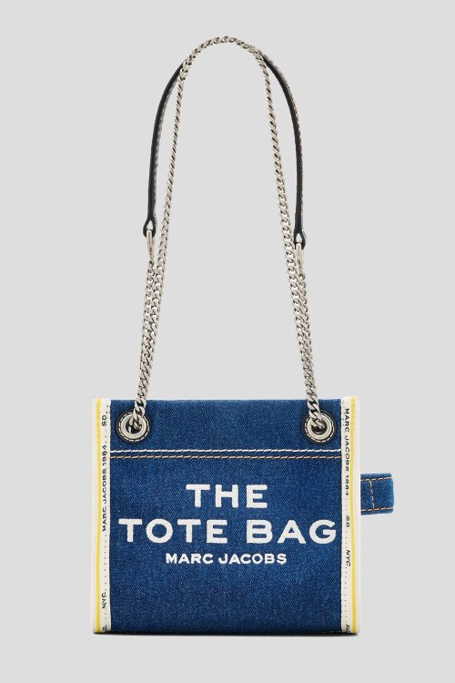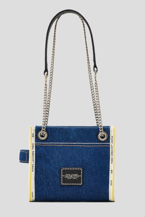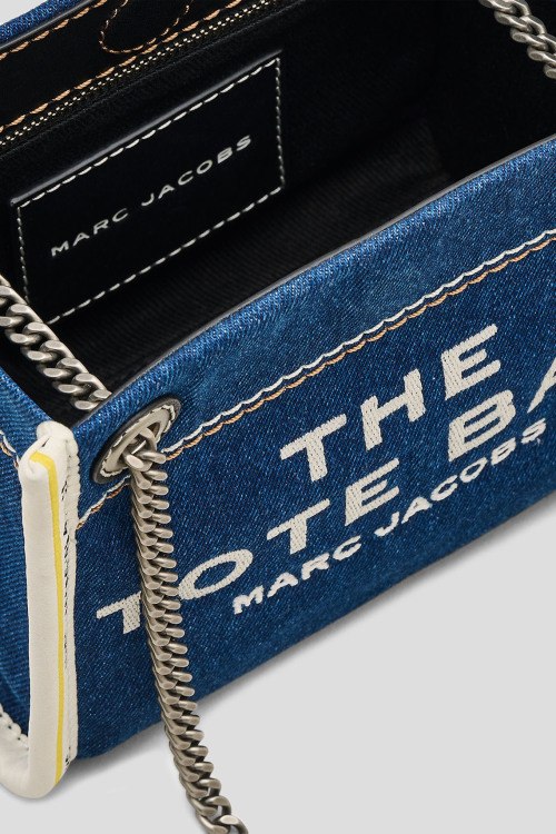 Детали: Женская темно-синяя джинсовая сумка кросс-боди The Denim Chain от Marc Jacobs (Марк Джейкобс). Принт с логотипом спереди, нашивка с логотипом сзади, плечевой ременьс цепочкой, серебристая фурнитура, одно отделение, один внутренний карман. Размеры: глубина 10 см, высота 15 см, ремешок 135 см, ширина 18 см
