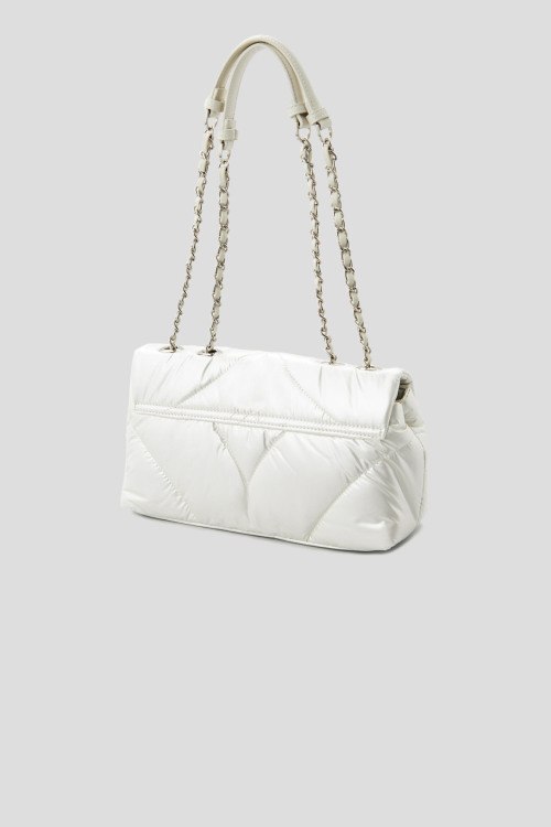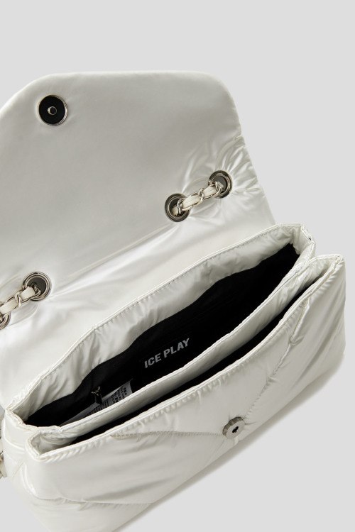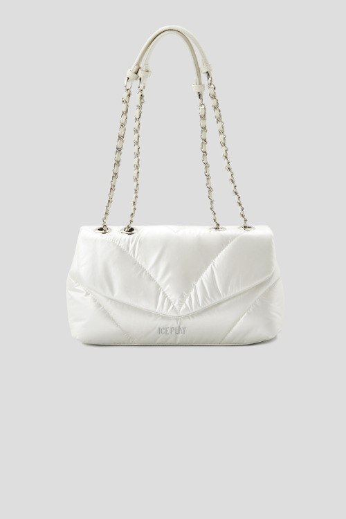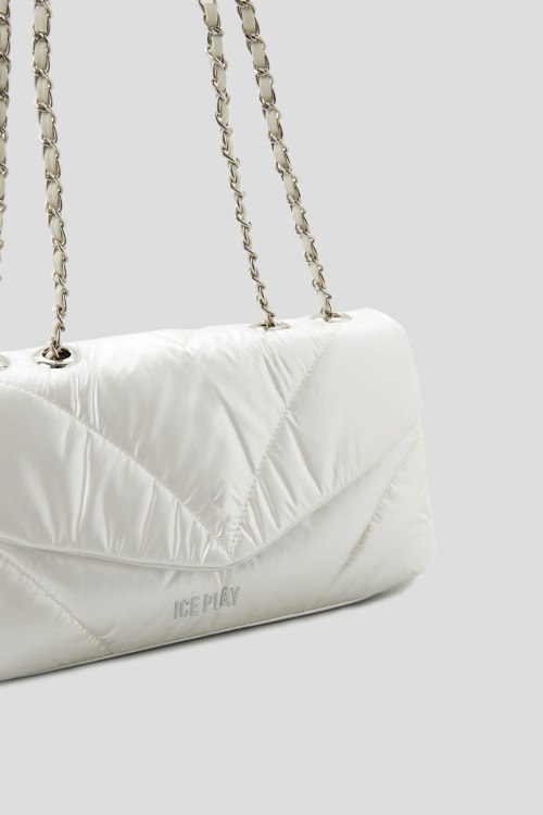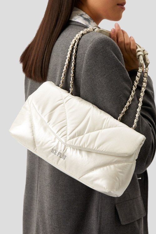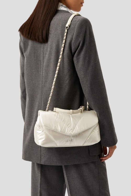 Детали: Женская белая текстильная сумка на плечо от Ice Play (Айс Плей). Модель с жемчужным отливом, стеганый дизайн, вышитый логотип, застежка на магнит, два отделения, ручка на плечо. Размеры: высота 15 см, ширина 30 см, ширина дна 9 см, длина ручек 8 см, длина плечевого ремня 120 см