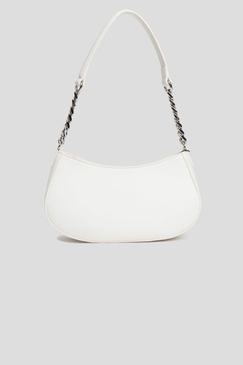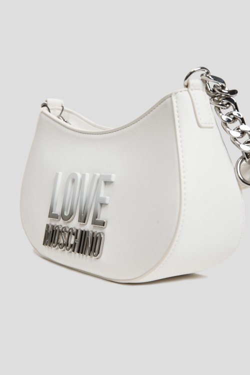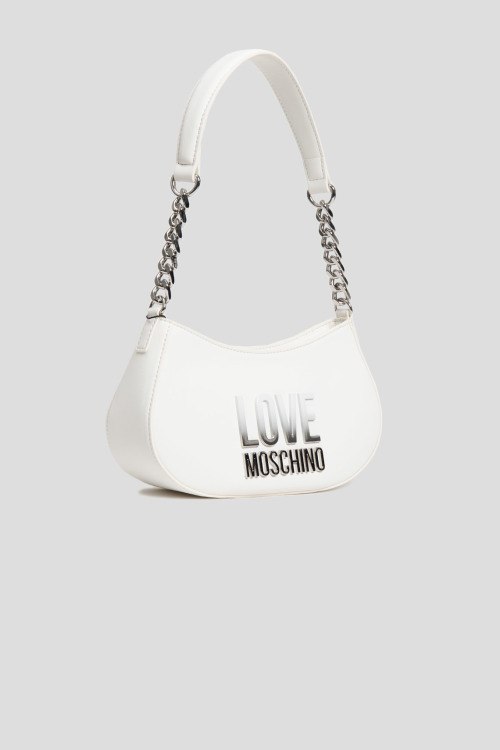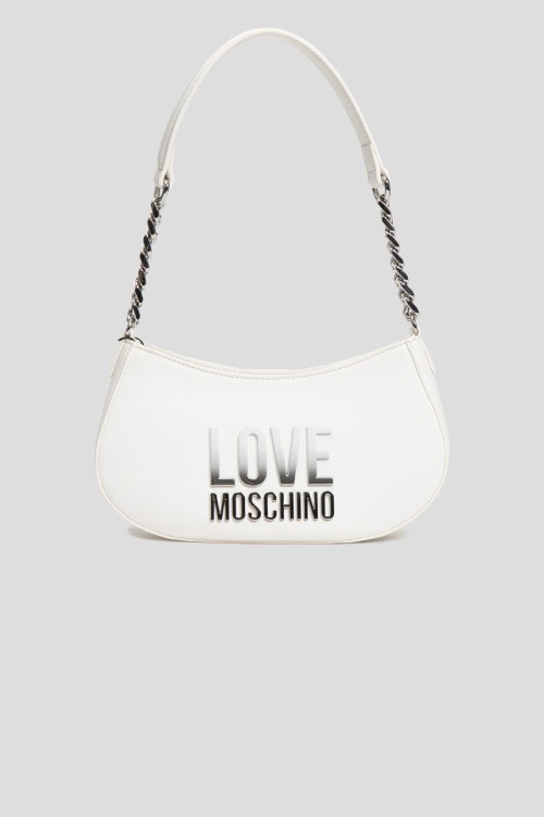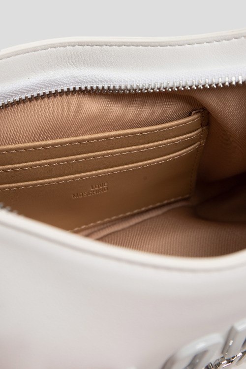 Детали: Женская белая сумка на плечо из экокожи от Love Moschino (Лав Москино). Одно отделение, застежка на молнию, слоты для кредитных карт, металлический логотип бренда с градиентом. плечевой ремень из экокожи и цепочки. Размер: 24 х 7 х 13 см