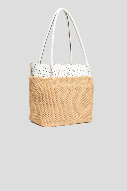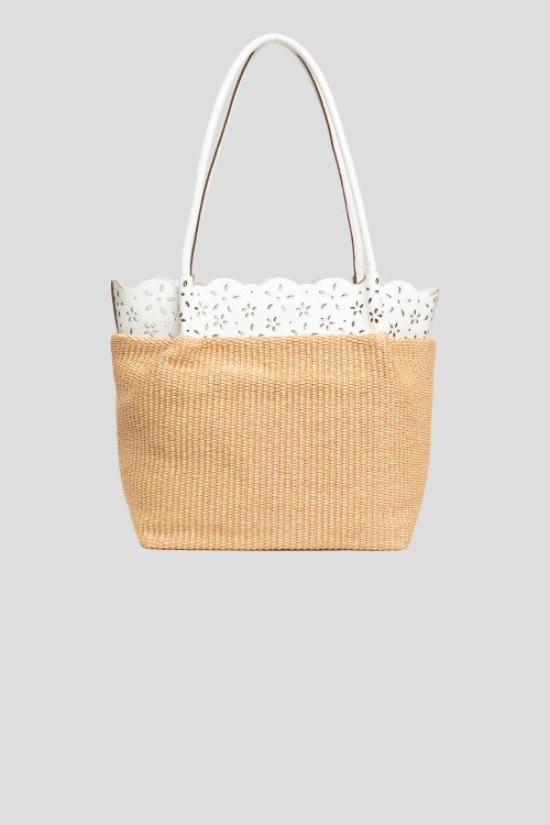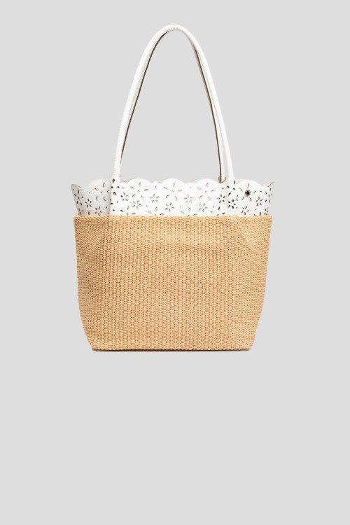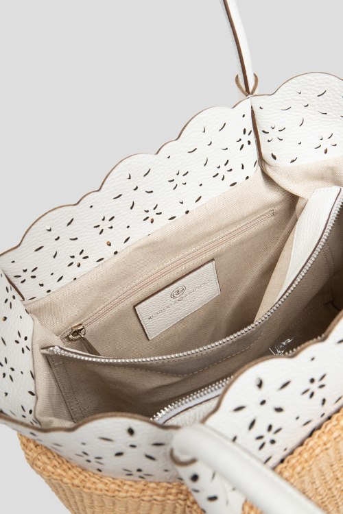 Женская бежевая сумка из натуральной кожи и рафии от Roberta Gandolfi (Робэрта Гандолфи). Плетеный дизайн, комбинация цветов и материалов, кожаная перфорированная вставка, одно отделение, застежка ан молнию, внутренний карман, патч-лого. Измерения: высота: 28 см, ширина: 36 см, высота ручек: 32 см, ширина по дну: 17 см