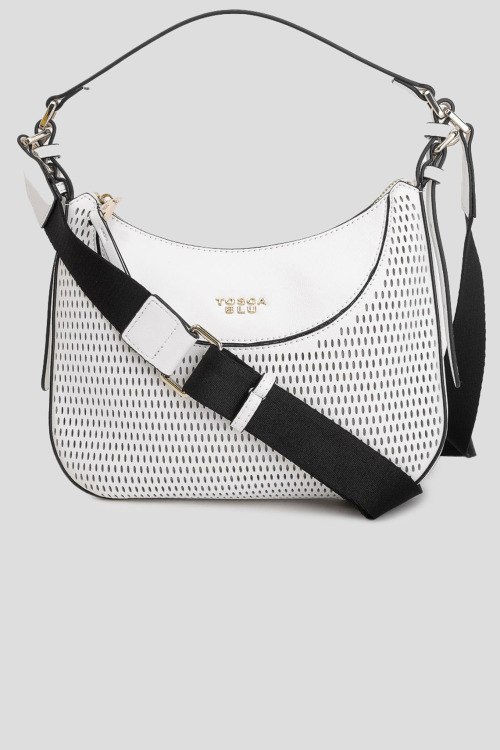 Детали: Женская белая кожаная сумка хобо от Tosca Blu (Тоска Блу). Модель из гладкой кожи, значок логотипа, золотистая фурнитура, дизайн с перфорацией, круглая ручка, регулируемый плечевой ремень, застежка-молния, одно отделение. Размеры: 25 х 16 х 5,5 см
