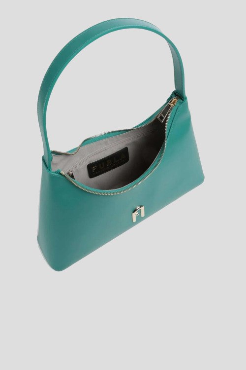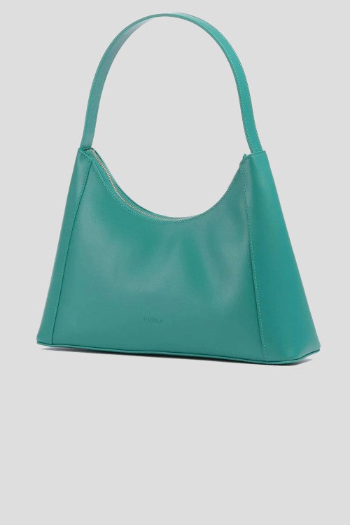 Детали: Женская кожаная сумка на плечо цвета аквамарин Diamante от Furla (Фурла). Модель из гладкой кожи, золотистая фурнитура, металлический логотип, застежка-молния, одно отделение, круглая ручка на плечо. Размеры: 34 x 24 x 8,5 см