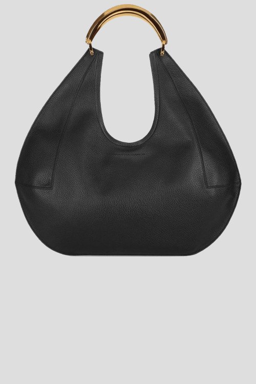 Детали: Женская черная сумка хобо из экокожи от Elisabetta Franchi (Елизабетта Франчи). Модель из зернистой кожи, тиснение логотипа, золотистая фурнитура, круглая ручка, одно отделение. Размеры: 51 x 47 см