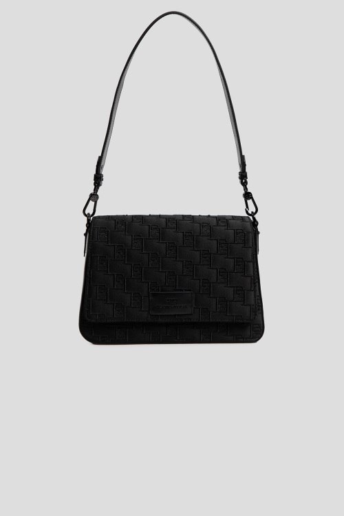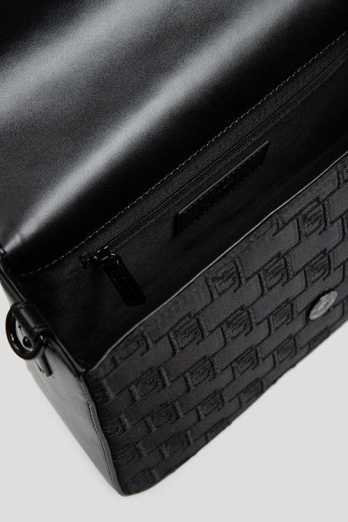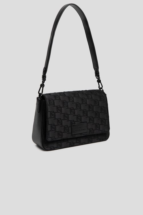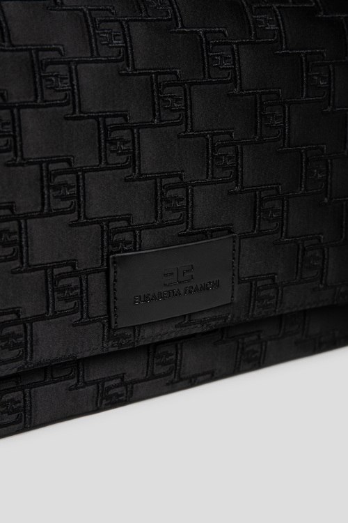 Детали: Женская черная атласная сумка на плечо от Elisabetta Franchi (Елизабетта Франчи). Вышитая монограмма по всей поверхности, нашивка с логотипом, застежка на магнит, регулируемый плчевой ремень, одно отделение. Размеры: 26 x 17 x 8,5 см