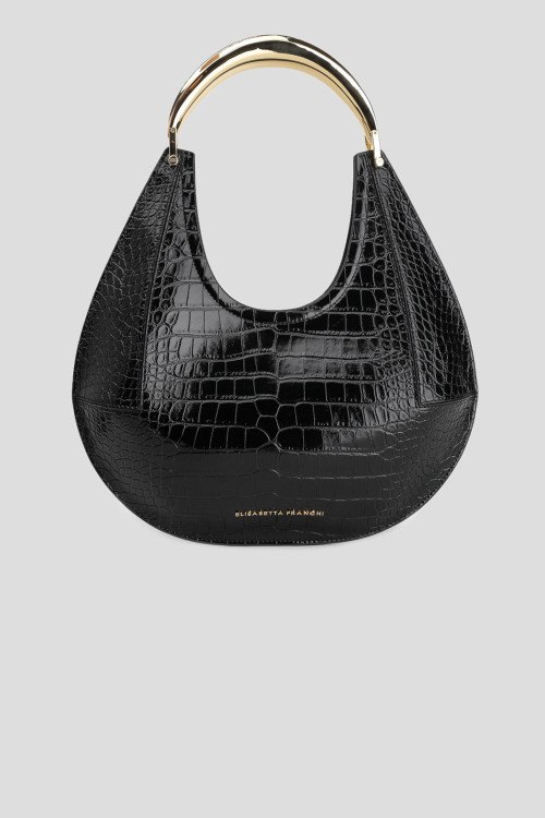 Женская черная сумка хобо из экокожи от Elisabetta Franchi (Елизабетта Франчи). Тиснение под кожу питона, значок с логотипом, круглая золотистая ручка, без застежки, одно отделение. Размеры: длина 35 см, ширина 5 см, высота с ручкой 40 см