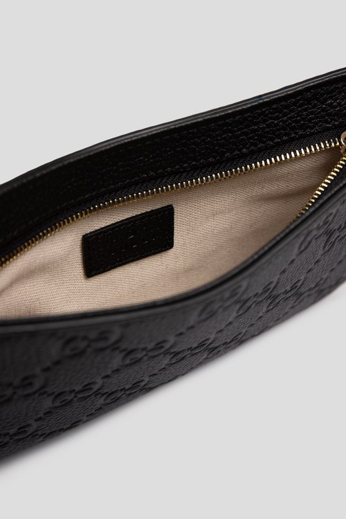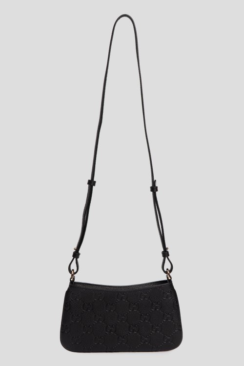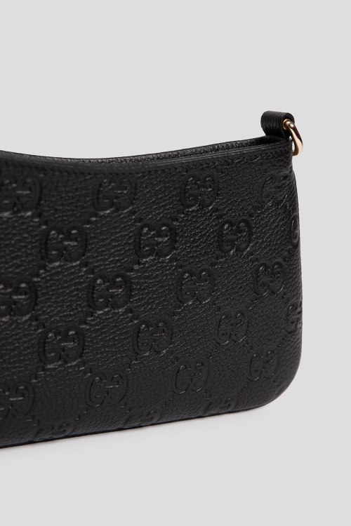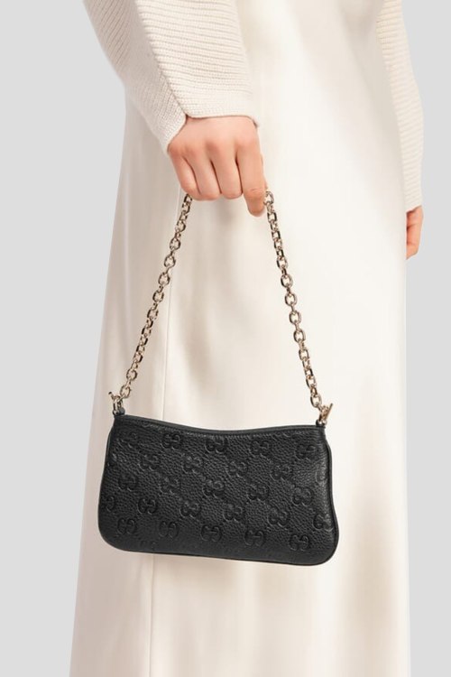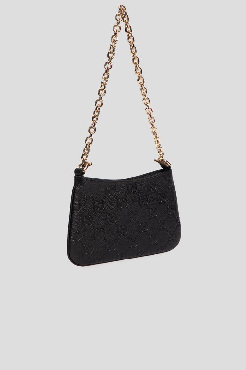 Женская черная кожаная маленькая сумка на плечо GG Emblem от Gucci (Гуччи). Модель из зернистой кожи, тисненная монограмма GG по всей поверхности, съемная золотистая цепочка, съемный черный плечевой ремень, застежка-молния, одно отделение. Размеры: 12 см х 22 см х 0,5 см. Комплектация: коробка, пыльник