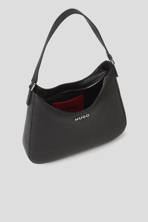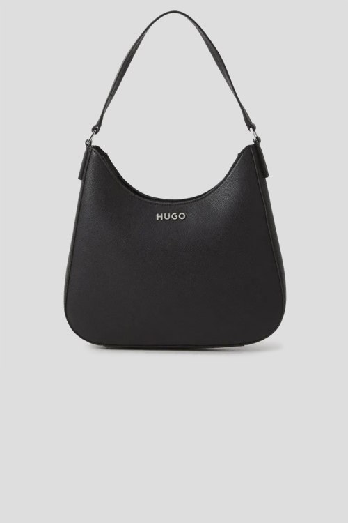 Детали: Женская черная сумка хобо из экокожи Chris от Hugo by Hugo Boss (Хуго бай Хуго Босс). Модель из зернистой кожи, значок с логотипом, серебристая фурнитура, плечевой ремень, застежка-молния, одно отделение. Размеры: 31 x 28 x 6.5 см