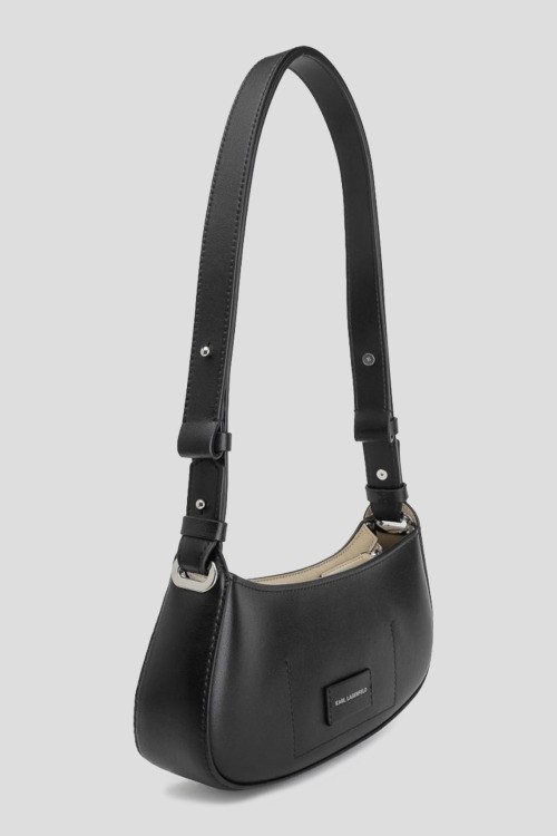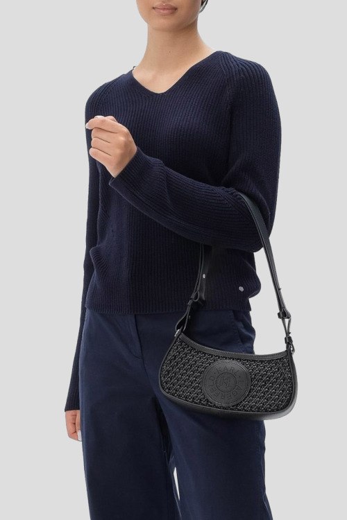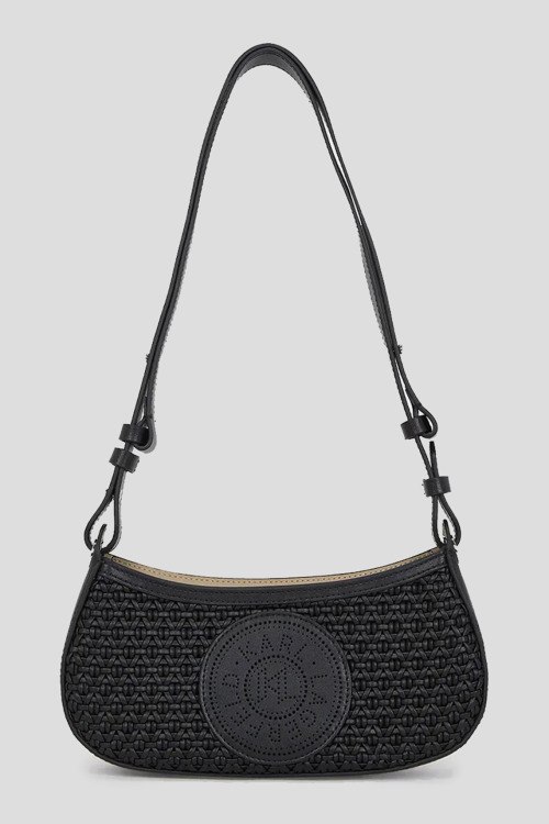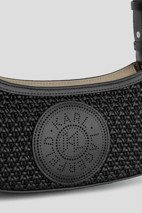 Детали: Женская черная сумка на плечо из экокожи К/Сircle от Karl Lagerfeld (Карл Лагерфельд). Плетеный дизайн, нашивка с логотипом, регулируемый плечевой ремень, застежка-молния, одно отделение. Размеры: глубина: 6 см, высота: 19 см, ширина у основания: 22 см