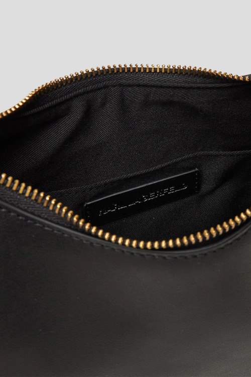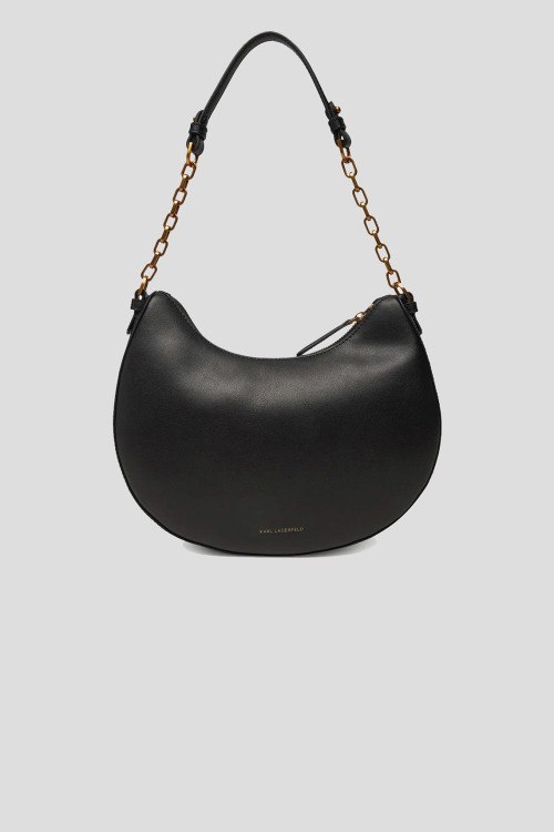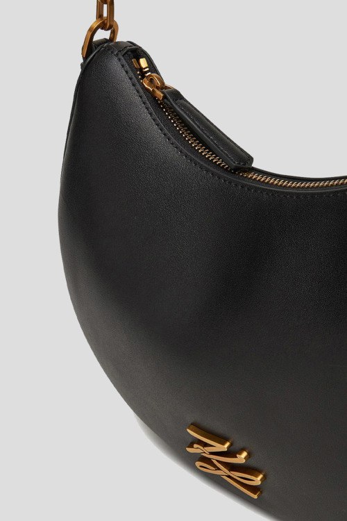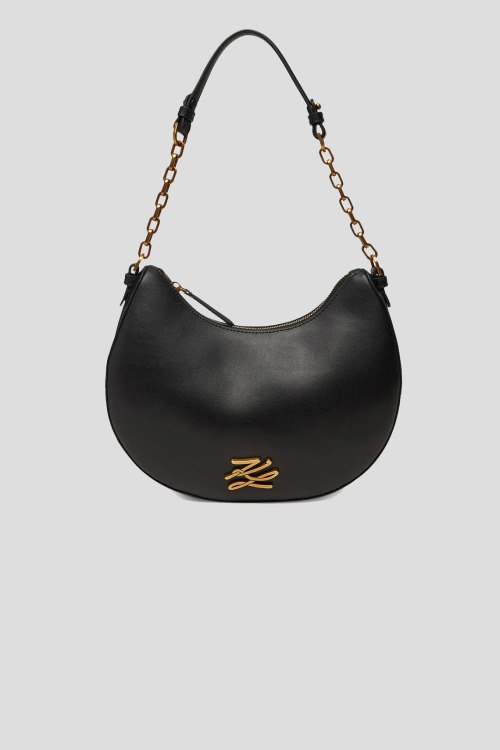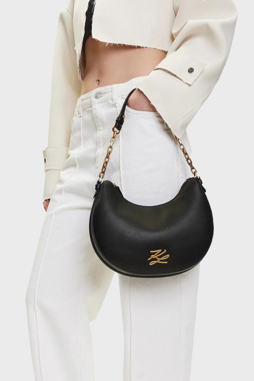 Детали: Женская черная кожаная сумка хобо K/Autograph от Karl Lagerfeld (Карл Лагерфельд). Модель из гладкой кожи, значок логотипа, золотистая фурнитура, застежка-молния, одно отделение, плечевой ремень с цепочкой. Размеры: высота: 21 см, ширина: 28 см, ширина по дну: 7.5 см
