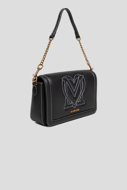 Детали: Женская черная сумка на плечо из полиуретана от Love Moschino (Лав Москино). Одно отделение, три кармана на молнии, дизайн с клапаном на магнитной застежке, съемный плечевой ремень из экокожи и цепочки, вышитый логотип бренда, фактурный лого золотистого цвета. Измерения: высота: 16 см, ширина: 26 см, ширина по дну: 9 см