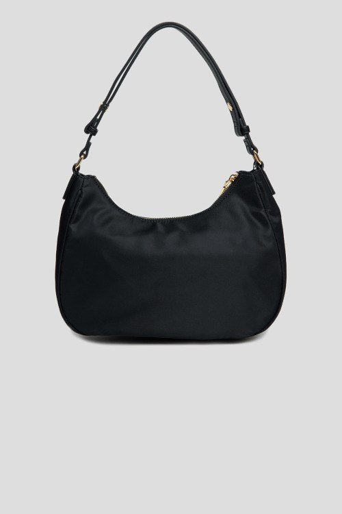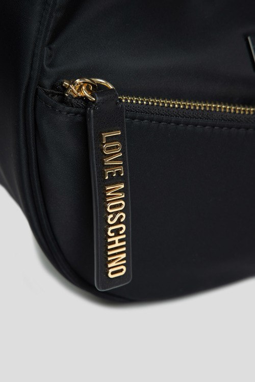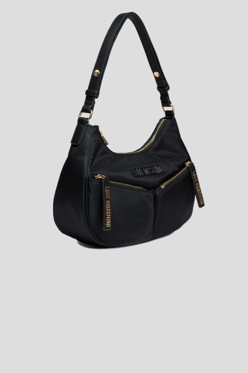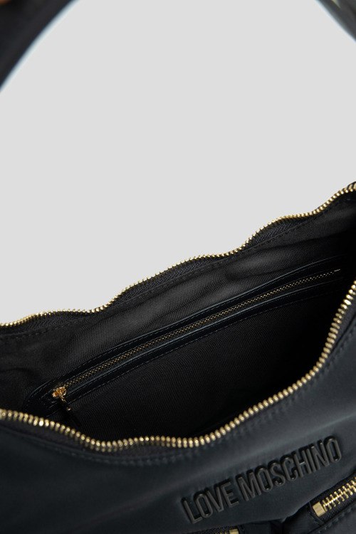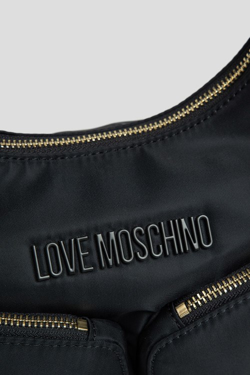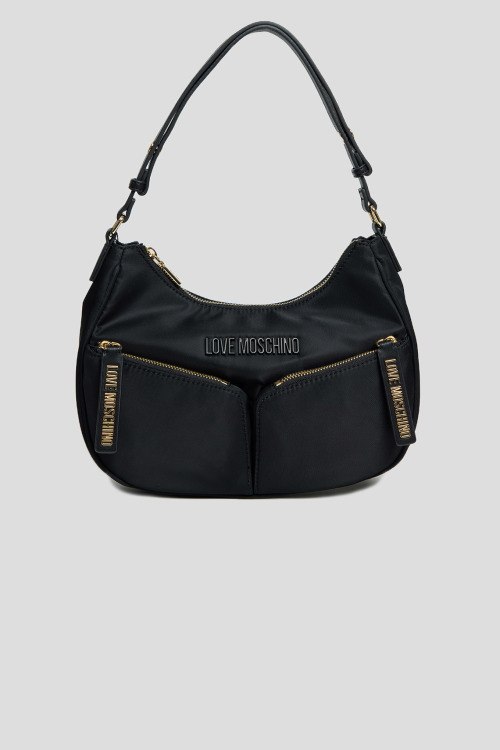 Детали: Женская черная текстильная сумка хобо от Love Moschino (Лав Москино). Нашивка с логотипом, золотистая фурнитура, два накладных карман на молнии, плечевой ремень, застежка-молния, одно отделение. Размеры: 29 х 17,5 х 11 см