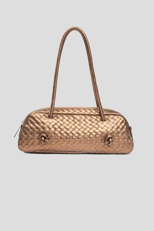 Женская золотистая сумка багет из натуральной кожи от Roberta Gandolfi (Робэрта Гандолфи). Одно отделение, прямоугольная форма, застежка на молнию, внутренний карман на молнии, стеганый дизайн, нерегулируемые две ручки. Измерения: высота: 16 см, ширина:38 см, высота ручек: 30 см, ширина по дну: 10 см