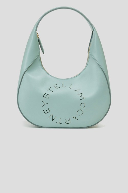 Женская голубая сумка на плечо из экокожи Small Stella от Stella McCartney (Стелла МакКартни). Застежка-молния, перфорированный логотип спереди, металлическая отделка золотистого цвета, одно внутреннее отделение. Размеры: высота - 26 см, ширина - 15 см, глубина - 6,5 см