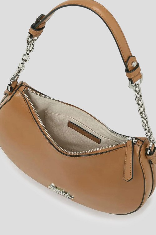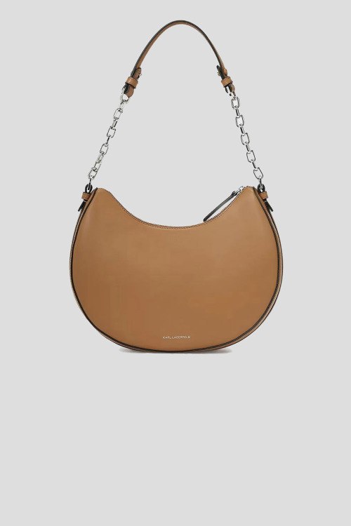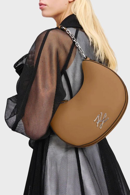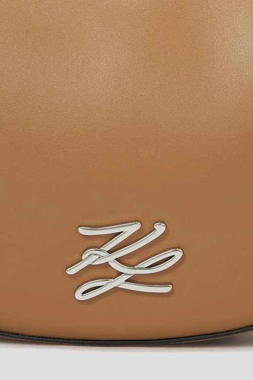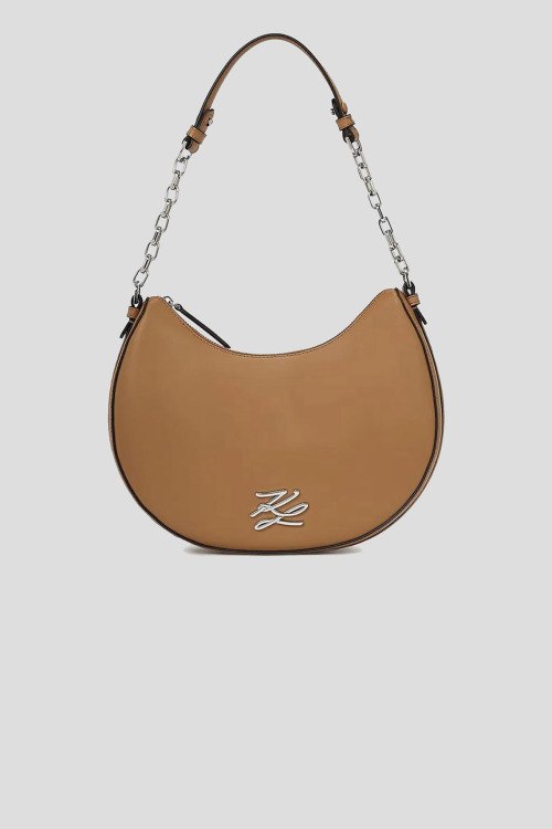 Детали: Женская кожаная сумка хобо цвета кэмел K/Autograph от Karl Lagerfeld (Карл Лагерфельд). Модель из гладкой кожи, значок логотипа, серебристая фурнитура, застежка-молния, одно отделение, плечевой ремень с цепочкой. Размеры: высота: 21 см, ширина: 28 см, ширина по дну: 7.5 см