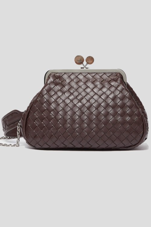 Женская коричневая кожаная сумка на плечо Pancia от Max Mara Weekend (Макс Мара Викенд). Модель из гладкой кожи, плетеный дизайн, серебристая фурнитура, плечевой ремень и цепочка, одно отделение.