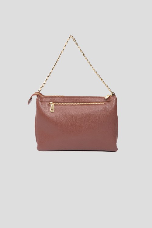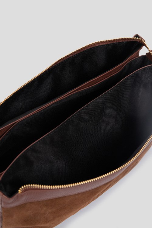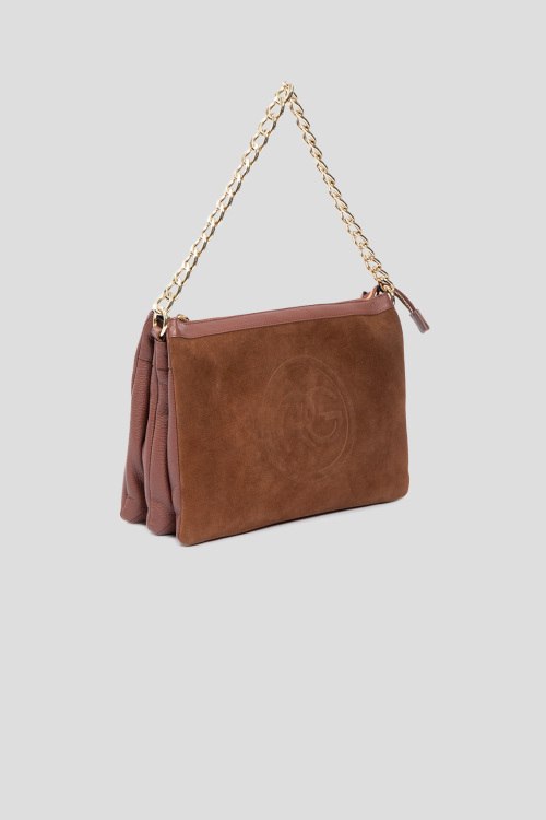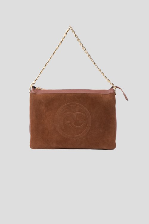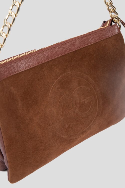 Детали: Женская коричневая сумка на плечо из замши и кожи от Roberta Gandolfi (Робэрта Гандолфи). Логотип спереди, золотистая фурнитура, цепочка и кожаный ремень на плечо, застежка-молния, сзади карман на молнии, два отделения. Размеры: высота 30 см, ширина 31 см, глубина 15 см
