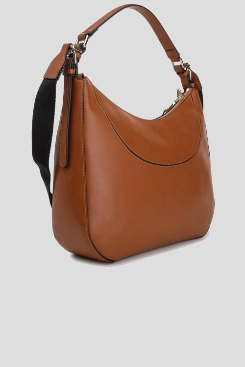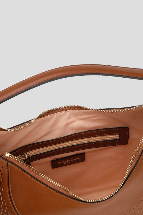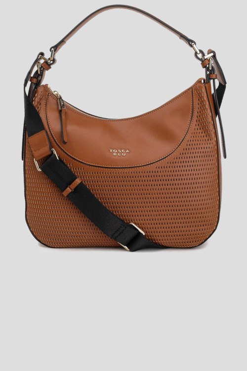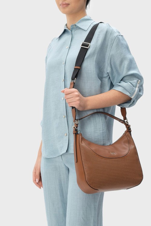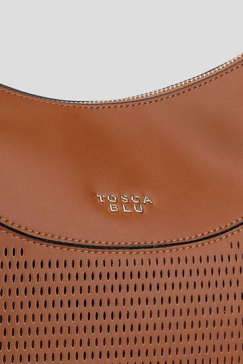 Детали: Женская коричневая кожаная сумка хобо от Tosca Blu (Тоска Блу). Модель из гладкой кожи, значок логотипа, золотистая фурнитура, дизайн с перфорацией, круглая ручка, регулируемый плечевой ремень, застежка-молния, одно отделение