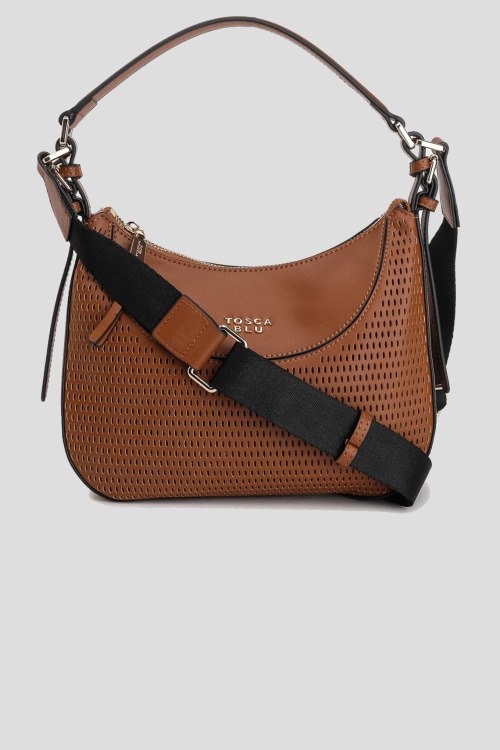 Женская коричневая кожаная сумка хобо от Tosca Blu (Тоска Блу). Модель из гладкой кожи, значок логотипа, золотистая фурнитура, дизайн с перфорацией, круглая ручка, регулируемый плечевой ремень, застежка-молния, одно отделение. Размеры: 25 х 16 х 5,5 см