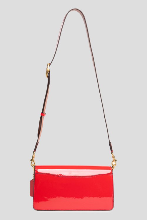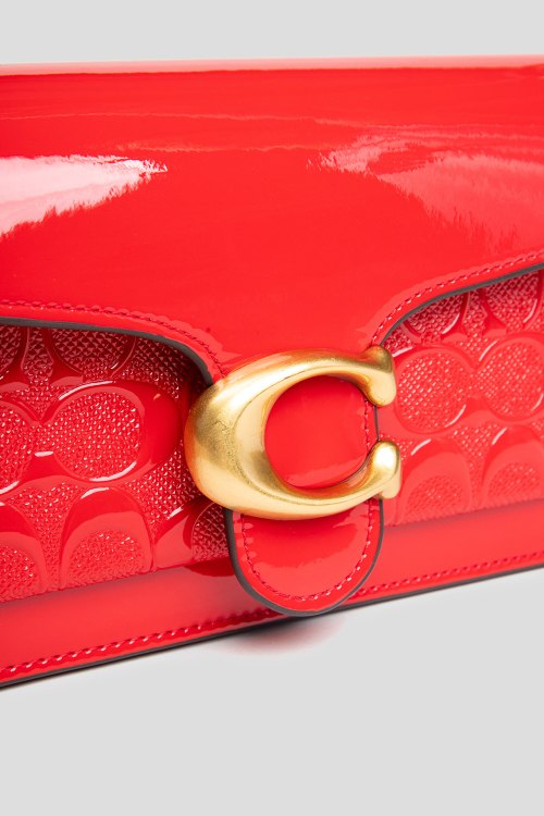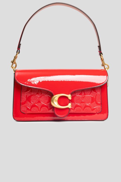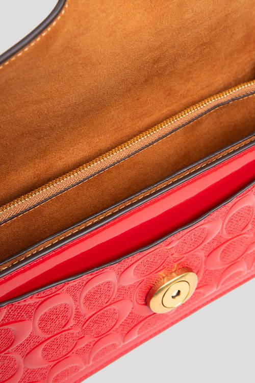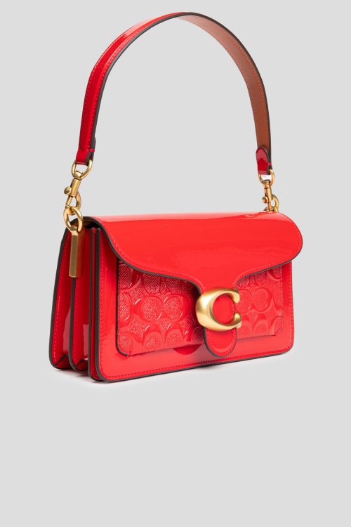 Детали: Женская красная лаковая сумка на плечо от Coach (Коуч). Глянцевый эффект, золотистая фурнитура, узор с монограммой, логотип спереди, застежка на магнит, два плечевых ремня, одно отделение, внутренний карман на молнии. Размеры: 25 х 14 х 8 см