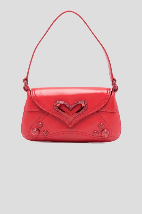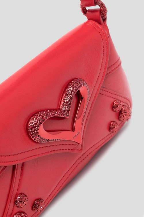 Детали: Женская красная кожаная сумка на плечо Baby 520 от Pinko (Пинко). Модель из кожи с винтажным эффектом, сердце декорировано кристаллами, ручка на плечо, застежка на магнит, одно отделение. Размеры: длина 22 см, ширина 3 см, высота 24 см