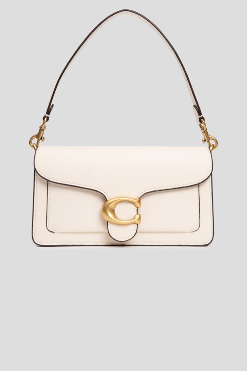 Детали: Женская кремовая кожаная сумка на плечо Tabby от Coach (Коуч). Модель из зернистой кожи, значок с логотипом, золотистая фурнитура, два плечевых ремня, застежка на магнит. Размеры: 26 х 13 х 7 см